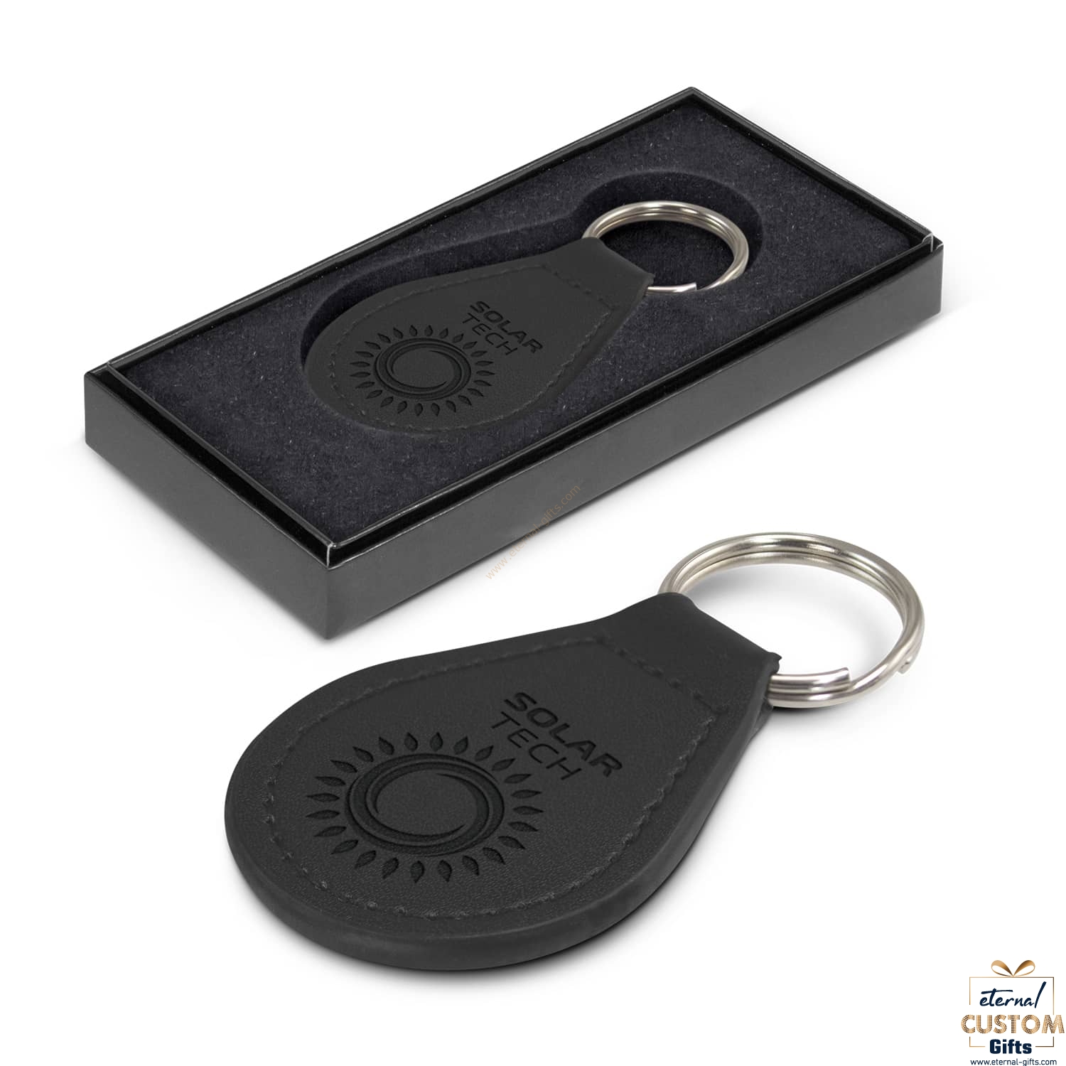 Round genuine leather key ring with smart matching stitching nicely presented in a black gift box.
