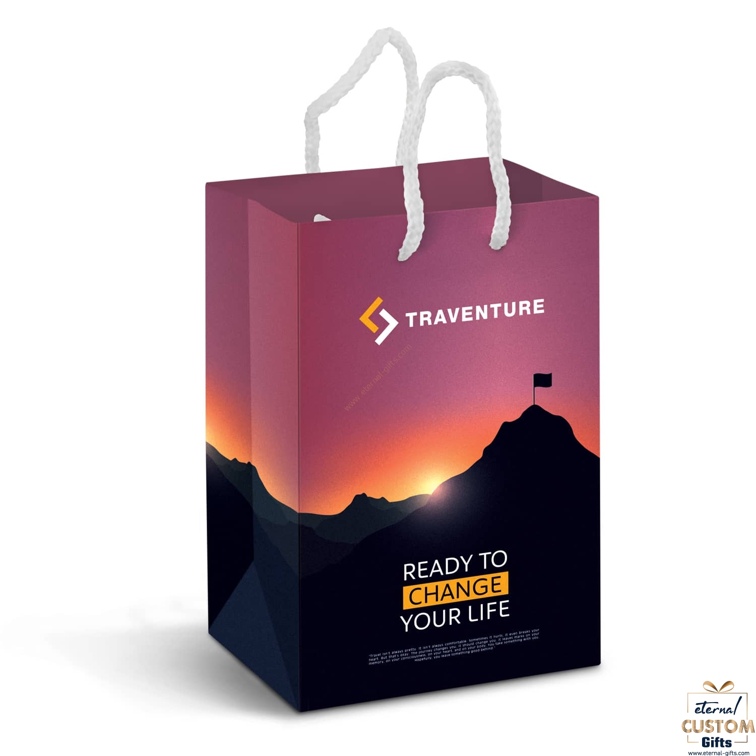 Small paper carry bag with strong woven polypropylene rope handles. It is manufactured from gloss laminated 157gsm art paper and can be branded with stunning edge-to-edge spot colour or full colour printing on all sides including the base. A production lead time of 35 working days applies to this product by air freight and larger orders can be sea freighted on request to reduce the freight cost.