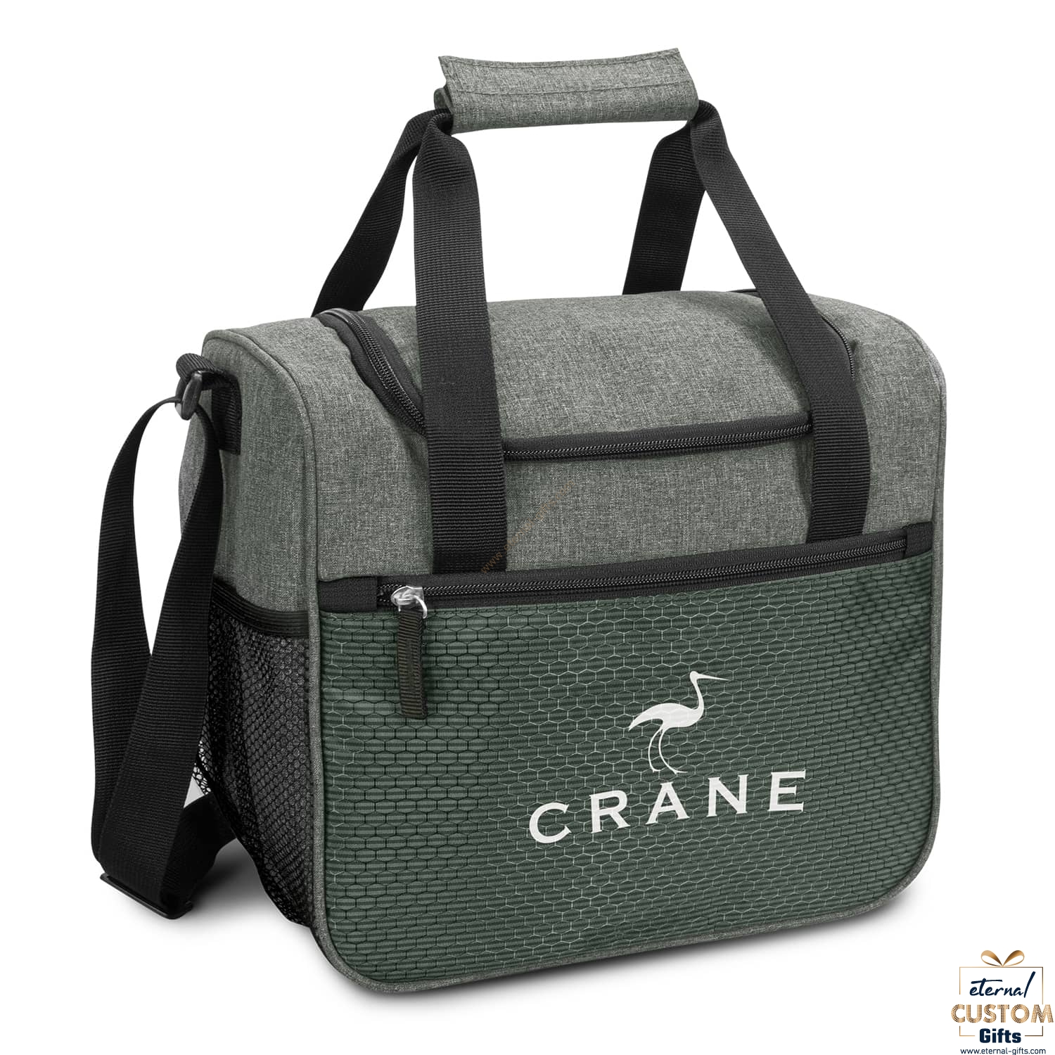 Sophisticated 12L cooler bag with thick PE foam insulation encased in a water-resistant PEVA inner liner. The outer construction is a combination of on-trend heather style 300D polyester and 600D polyester. Velocity has a distinctive front pocket with an eye-catching patterned finish and a zippered closure. Other features include a zippered top opening, an adjustable woven shoulder strap, woven carry handles with a Velcro cuff, two mesh side pockets and smart woven zipper pulls.