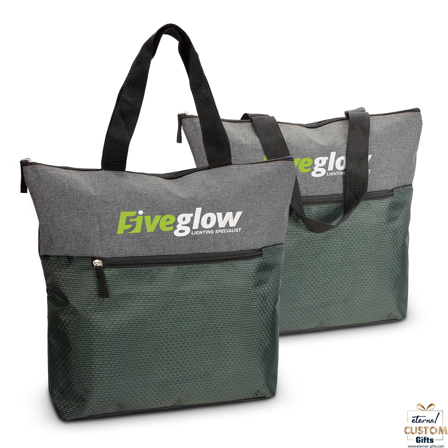 Sophisticated tote bag which is manufactured from a combination of on-trend heather style 300D polyester with a 600D polyester back panel. It has a distinctive front pocket with an eye-catching patterned finish and a zippered closure. Other features include strong woven carry handles, a secure zippered top closure, smart woven zipper pulls and a base gusset for added carrying capacity.