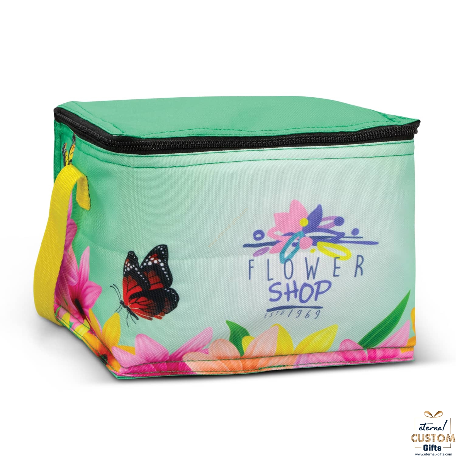 Small 4.5L cooler bag which is manufactured from tough 600D polyester. The outer panels including the base can be branded with stunning edge-to-edge full colour print. It has aluminium foil laminated PE foam insulation, a black zippered top closure and a woven carry handle. The carry handle is available in the choice of 10 standard colours which can be mixed and matched. A production lead time of 25 working days applies to this product by air freight and larger orders can be sea freighted on request to reduce the freight cost.