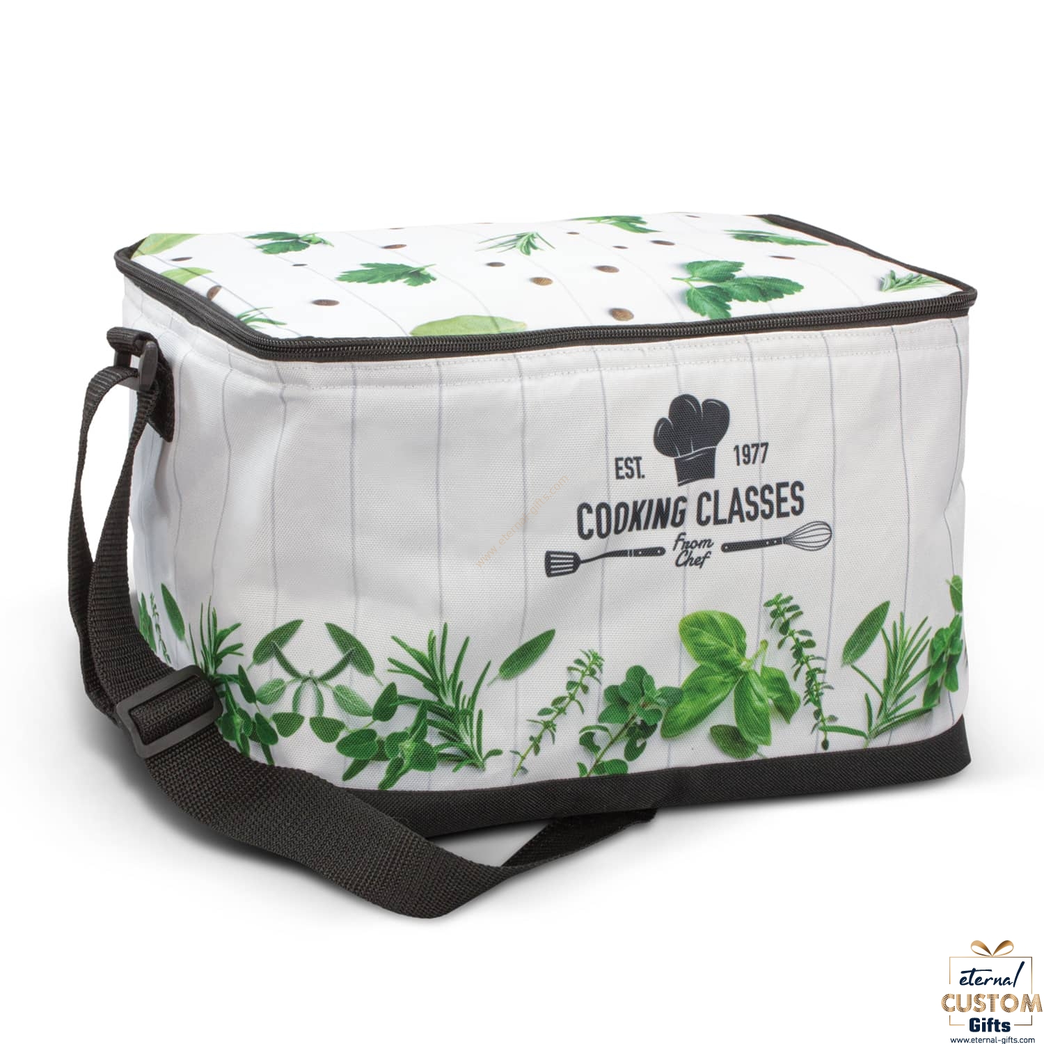 Large 10L cooler bag which is manufactured from tough 600D polyester. The outer panels can be branded with stunning edge-to-edge full colour print and it has PE foam insulation encased in a water-resistant PEVA inner liner. Bathurst has a black zippered top closure and an adjustable woven shoulder strap. The shoulder strap and the small panel behind the zip are available in the choice of 10 standard colours which can be mixed and matched. These materials have been matched as closely as possible. The shoulder strap slider and connectors are black. A production lead time of 30 working days applies to this product by air freight and larger orders can be sea freighted on request to reduce the freight cost.