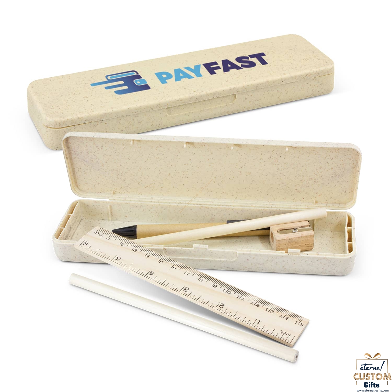 Unique rectangular pencil case which is manufactured from a 50/50 blend of natural wheat straw fibre and BPA-free polypropylene. Included inside the pencil case is a 15cm wooden ruler with measurements in inches and centimetres, two wooden HB pencils, a wooden pencil sharpener and a retractable ballpoint pen with a cardboard barrel.