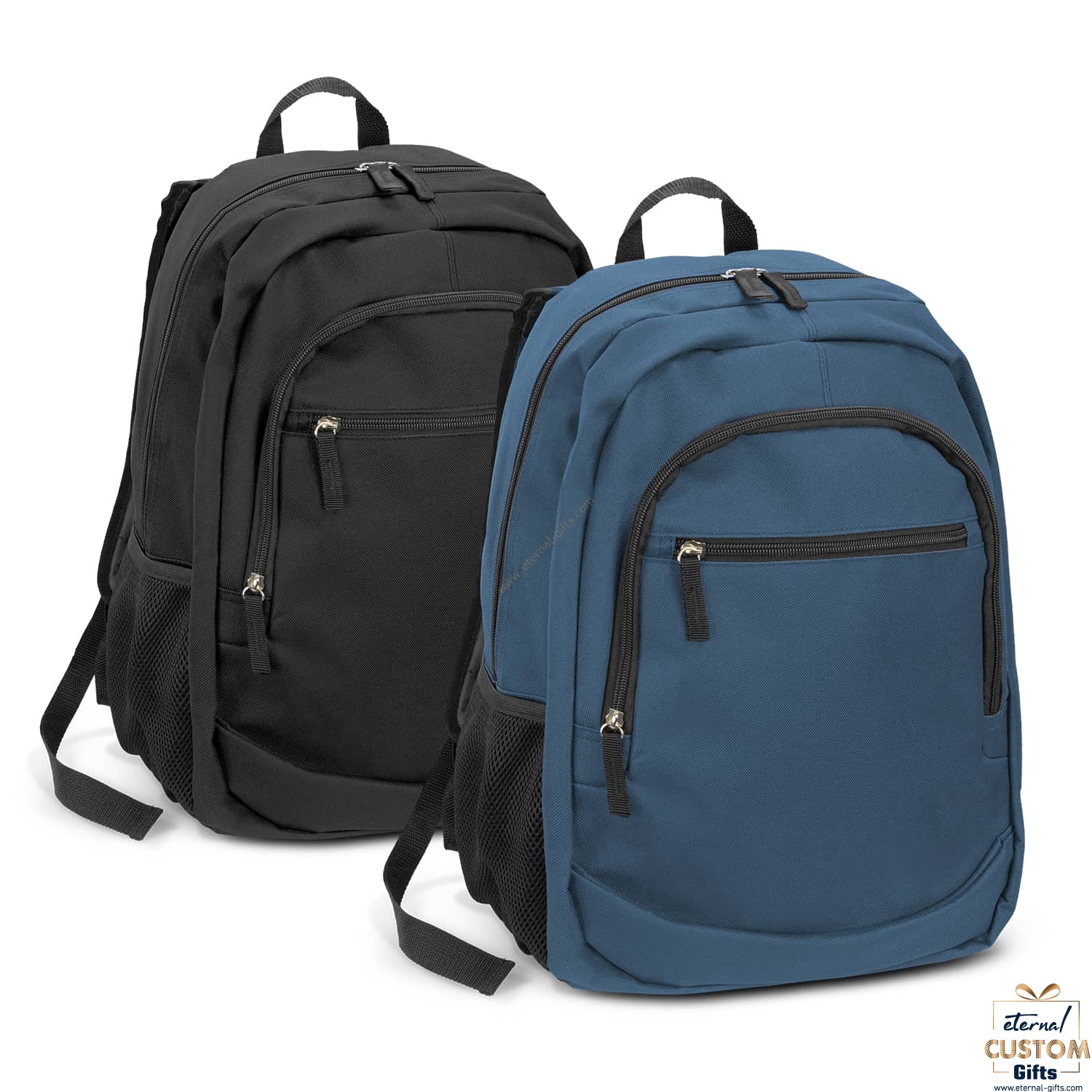 Robust backpack which is manufactured from 600D polyester. It has a main zippered compartment with an internal laptop sleeve and two zippered external pockets on the front. Other features include a padded back, adjustable woven shoulder straps, a woven carry handle, two mesh side pockets and woven zipper pulls.