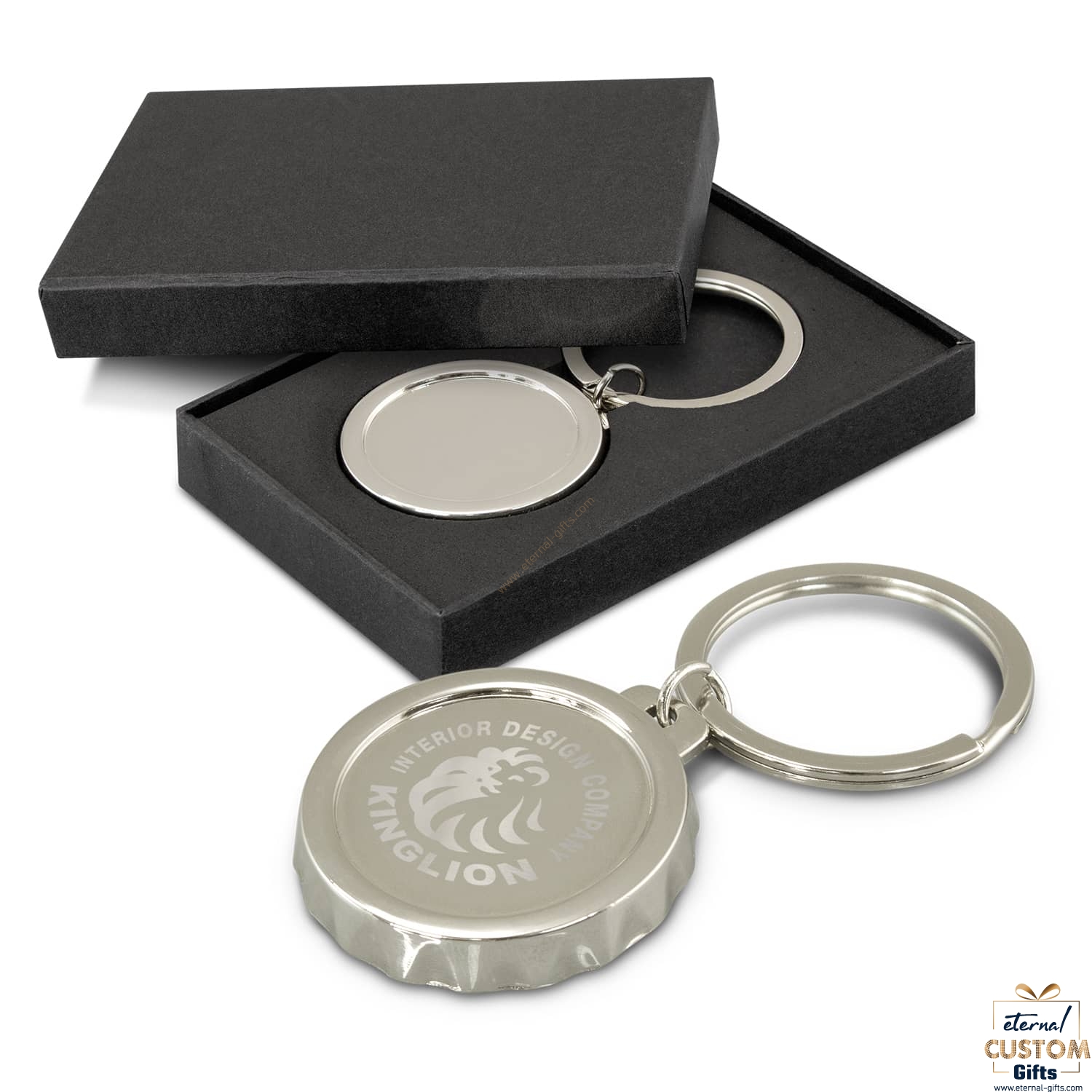 Unique key ring shaped like a bottle cap with a bottle opener on the reverse. Orleans has a plated shiny chrome finish which laser engraves to a natural etch and is presented in a black gift box.