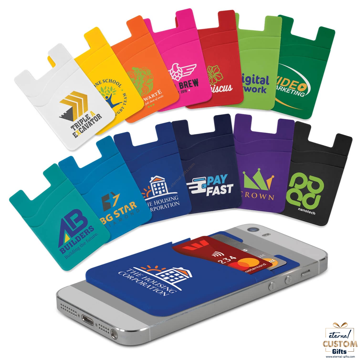 Soft-touch silicone wallet which adheres securely to the back of a phone or phone case with strong adhesive that won’t leave marks if it is removed. It has two pockets and is ideal for holding a drivers licence, ID, hotel key, credit cards or business cards. A production lead time of 25 working days applies to this product by air freight and larger orders can be sea freighted on request to reduce the freight cost.
