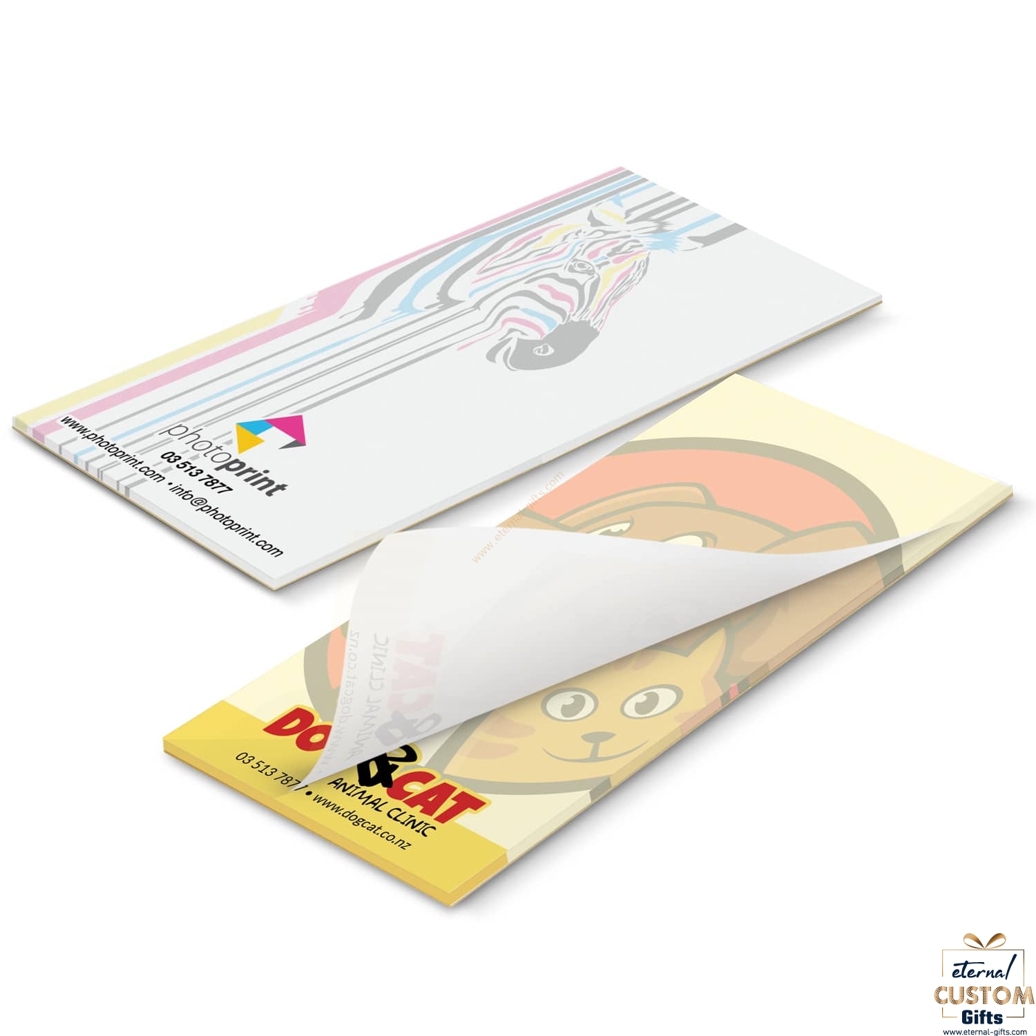Very affordable 90mm x 160mm size note pad which has 25 leaves of 70gsm paper which can be branded in edge-to-edge full colour at no extra cost. The note pad is padded at the top and has an unbleached cardboard back. A production lead time of 25 working days applies to this product.