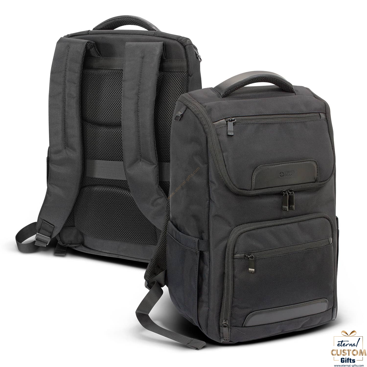 Make the daily commute easier and more stylish with the Swiss Peak Voyager Laptop Backpack. It is manufactured from premium 1680D polyester fabric with smart PU accents and 210D polyester lining. The large main compartment has a zip-around closure and includes a padded pocket that will comfortably hold a 15-inch laptop, two slip pockets that offer RIFD protection and a USB outlet. The back of the backpack is heavily padded for extra comfort and the padded shoulder straps are fully adjustable. Other features include two side pockets with elastic openings to hold water bottles and other accessories, three external zippered pockets, a padded carry handle and a rear luggage sleeve that slides over the handle of a rolling suitcase. The Swiss Peak logo is subtly debossed on the front of the bag and branded on the laptop pocket.