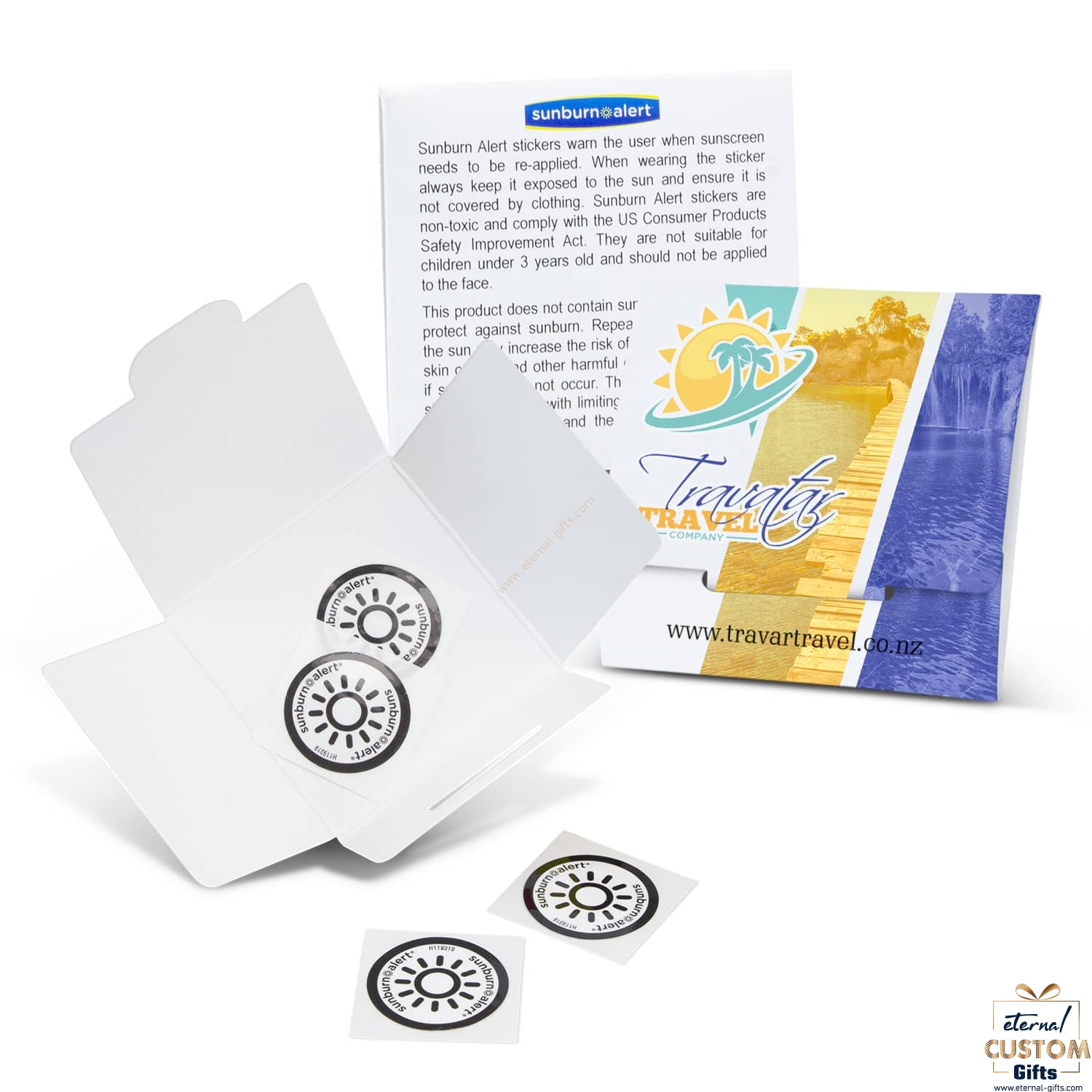 Pack of four Sunburn Alert Stickers that take the guesswork away from when it is time to re-apply sunscreen. They are a practical and easy to use warning device for anyone who is out in the sun. The user places a sticker on the back of their hand and applies sunscreen over it at the same time it is being applied to other parts of the body. Each sticker is UV sensitive and turns blue when sunscreen protection diminishes and the skin is being exposed to harmful UV rays. The sticker will turn white again when sunscreen is re-applied, indicating protection has been restored. Instructions for application and use are printed on the cardboard pack and it can be branded in full colour on the front at no extra cost. This product is not suitable for children under three years old, does not contain sunscreen and does not protect the user against sunburn. A production lead time of 25 working days applies to this product by air freight.