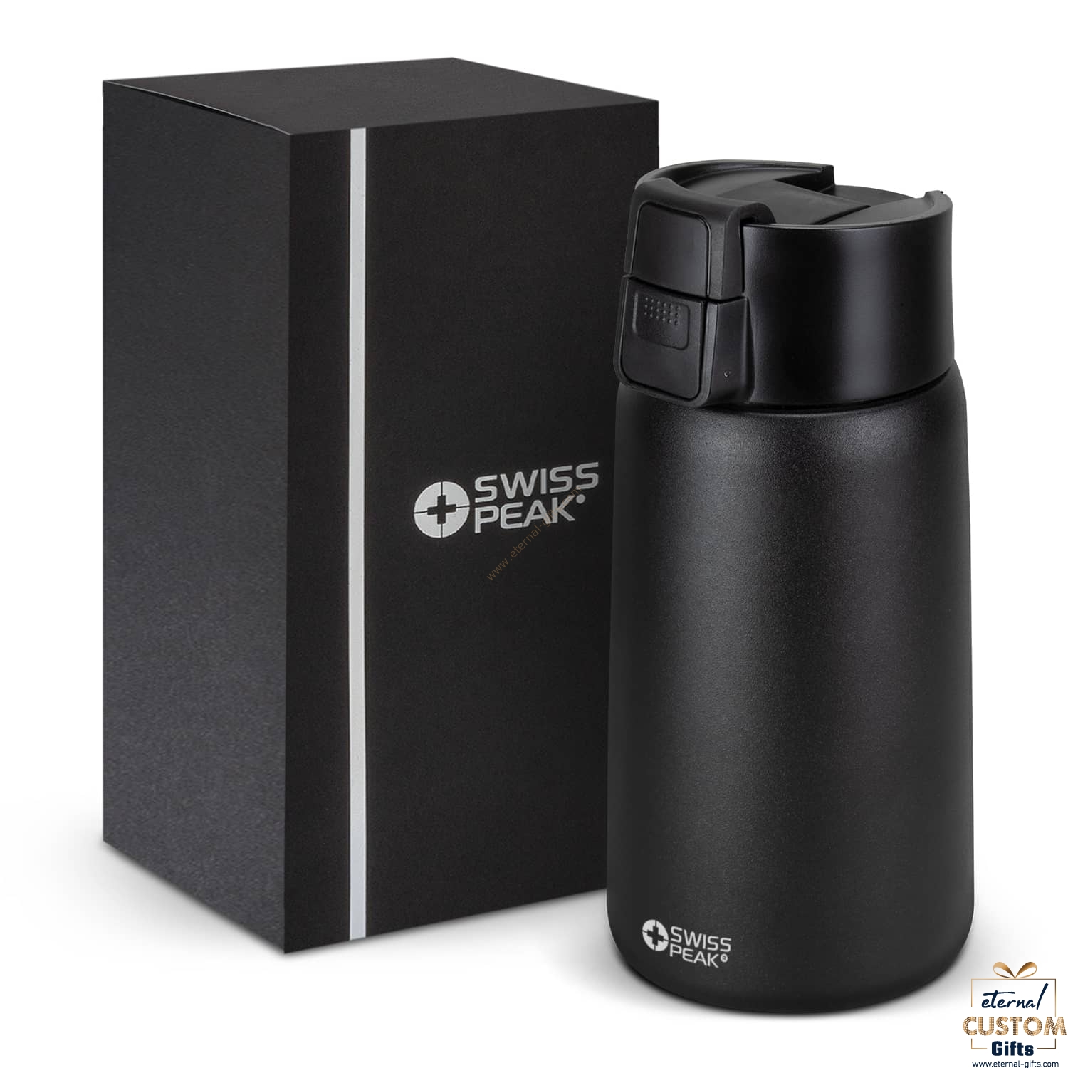 Premium 500ml Swiss Peak double wall, vacuum insulated stainless steel mug with a smart powder-coated finish that will keep drinks warm for hours. Stealth has a wide top opening with a secure screw-on lid and a push-button activated flip closure which is spring loaded for smooth, effortless operation. It is ideal for coffee as well as taking soup and food to work or school. This precision mug is BPA-free, and laser engraves to a shiny steel finish. It is presented in a Swiss Peak gift box with an information leaflet. This product is not dishwasher safe, and handwashing is recommended.