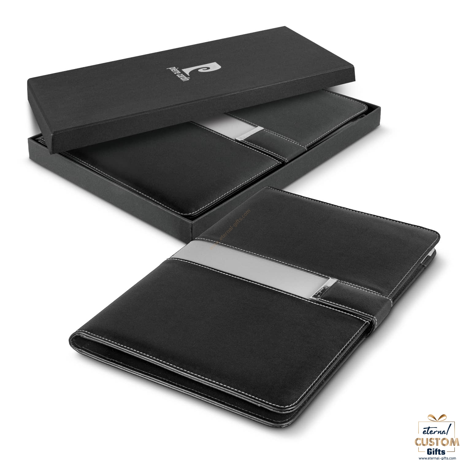 Classically designed portfolio from Pierre Cardin which is hand crafted from the highest quality leather-look PU. It has a smart magnetic closure and a Pierre Cardin note pad with 30 leaves of 80gsm lined cream paper. Valence has a large slip pocket which will hold a tablet and a smaller zippered pocket. Other features include a card holder with a window, a phone pocket, four card pockets and an elastic pen loop. The Pierre Cardin logo is tastefully engraved on the magnetic closure and debossed on both the phone holder and the back of the portfolio. Valence is beautifully presented in a premium Pierre Cardin gift box.