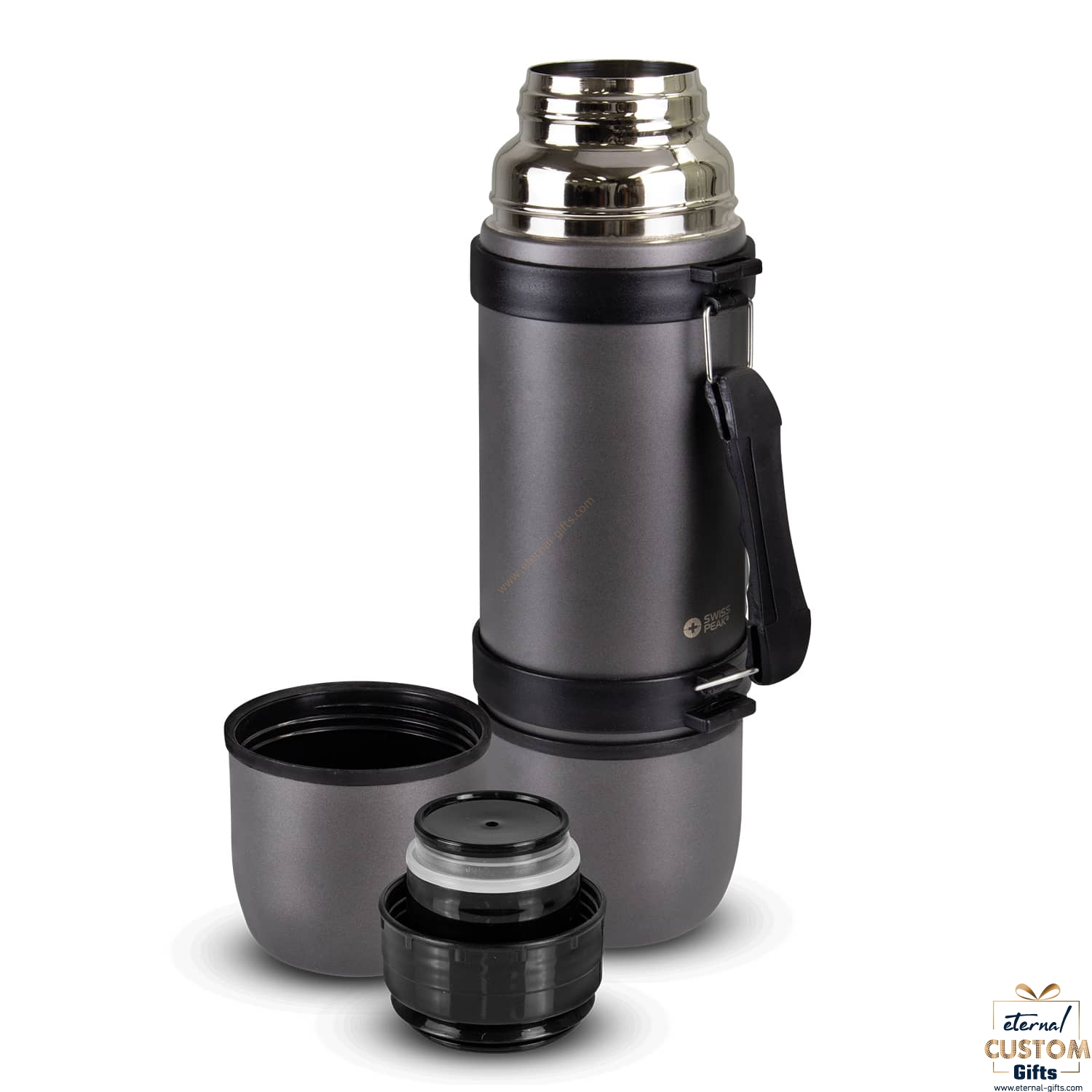 Swiss Peak has design and functionality in mind with this 700ml Vacuum flask. This Stainless steel double wall vacuum flask is paired with a hand grip. Fitted with two matching cups making for an optimal drinking experience. This flask is leak-proof, and handwashing is recommended. The Swiss Peak logo is located underneath the carry handle. Laser engraving on this product comes as a stainless steel finish. Presented in a premium Swiss Peak black gift box.
