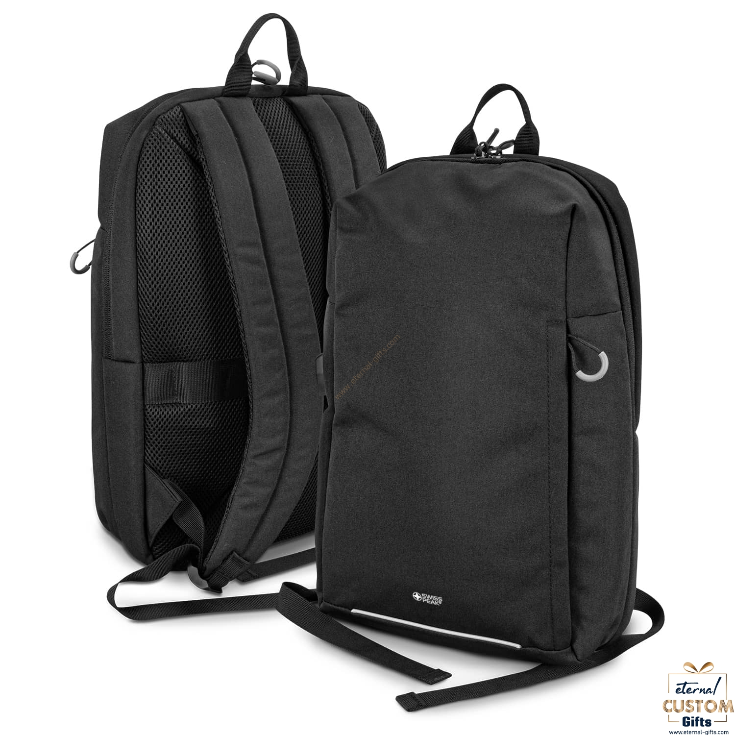 Your everyday essential, this Swiss Peak laptop bag fits all your daily needs, perfect for business or leisure trips. Designed with anti-theft RFID technology, it is fitted with a padded 15.6inch laptop compartment. Manufactured from polyester and fitted with a reflective safety strip. Other features include adjustable back straps, a trolley strap, and a USB output for charging on the go. The Swiss Peak logo is at the base of the bag.