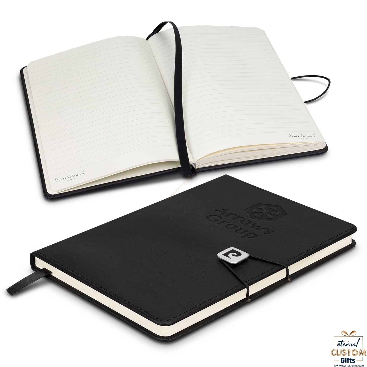 Quality notebook that has 80 leaves of cream lined 80gsm paper with a thermo PU cover and a branded metal buckle. The Pierre Cardin logo is debossed on the back cover of the notebook.