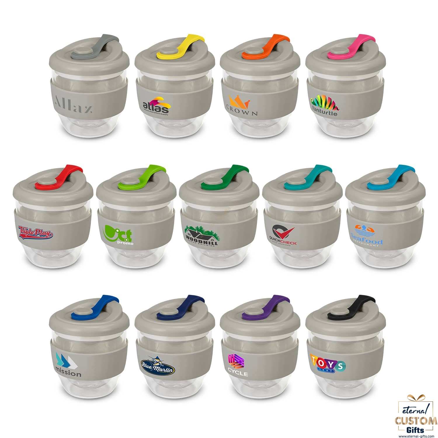 Exquisite 230ml double wall borosilicate glass coffee cup with a secure push-on polypropylene lid with silicone swivel closure and a wide heat-resistant silicone band. Borosilicate glass is incredibly light and very strong. The double wall construction keeps drinks hot for longer while the outside of the glass remains comfortable to hold. The silicone flip closure can come in any colour from the standard colours at no extra cost. Up to five different colour combinations are included in the price and more are available for an additional charge. This product is not dishwasher safe and handwashing is recommended.