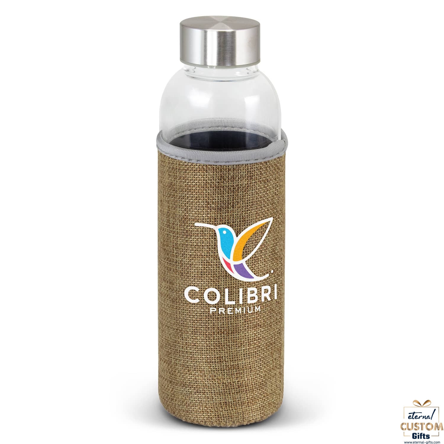 Deluxe 600ml borosilicate glass drink bottle which features an insulating soft poly jute sleeve that helps to keep drinks cool. The sleeve is fashion-inspired textured polyester outer. It has a secure screw-on stainless steel lid which can be laser engraved with a logo. Borosilicate is a lightweight glass that is exceptionally strong and shatter-resistant. Glass is a natural choice for a clean, pure taste and is a safe and reusable plastic alternative. This product is not intended to be used with carbonated or hot liquids. It is not dishwasher safe and handwashing is recommended.