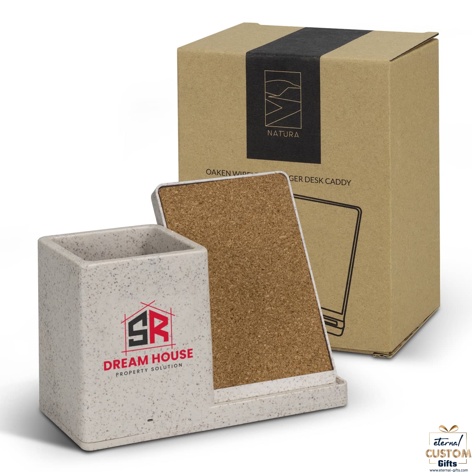 - 10W Fast wireless charger desk caddy manufactured from wheat straw fibre, ABS and cork.