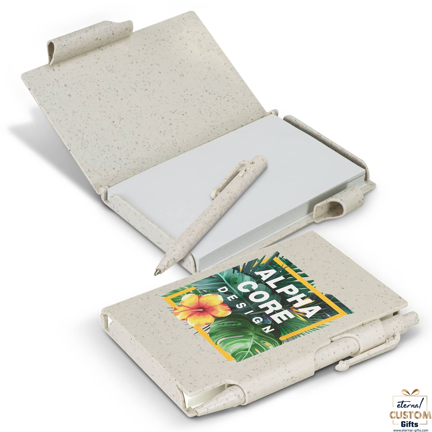 Pocket-size notebook in a compact case made from a blend of natural wheat straw fibre and ABS plastic. The notebook includes a pen that locks the case closed when in the pen holder, and features a pad with 80 leaves of unlined paper.