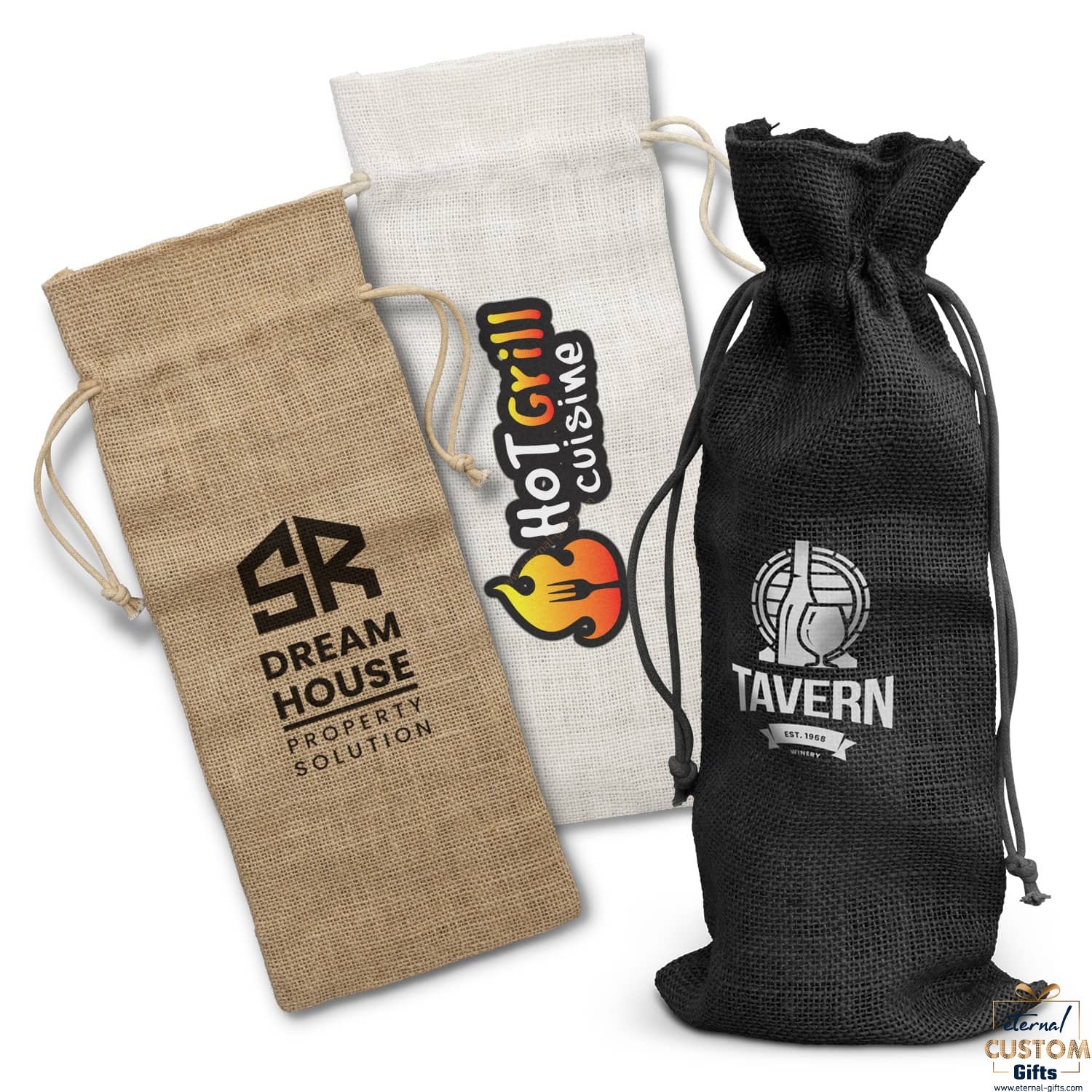 Natural unlaminated jute drawstring wine gift bag with cotton drawstrings.