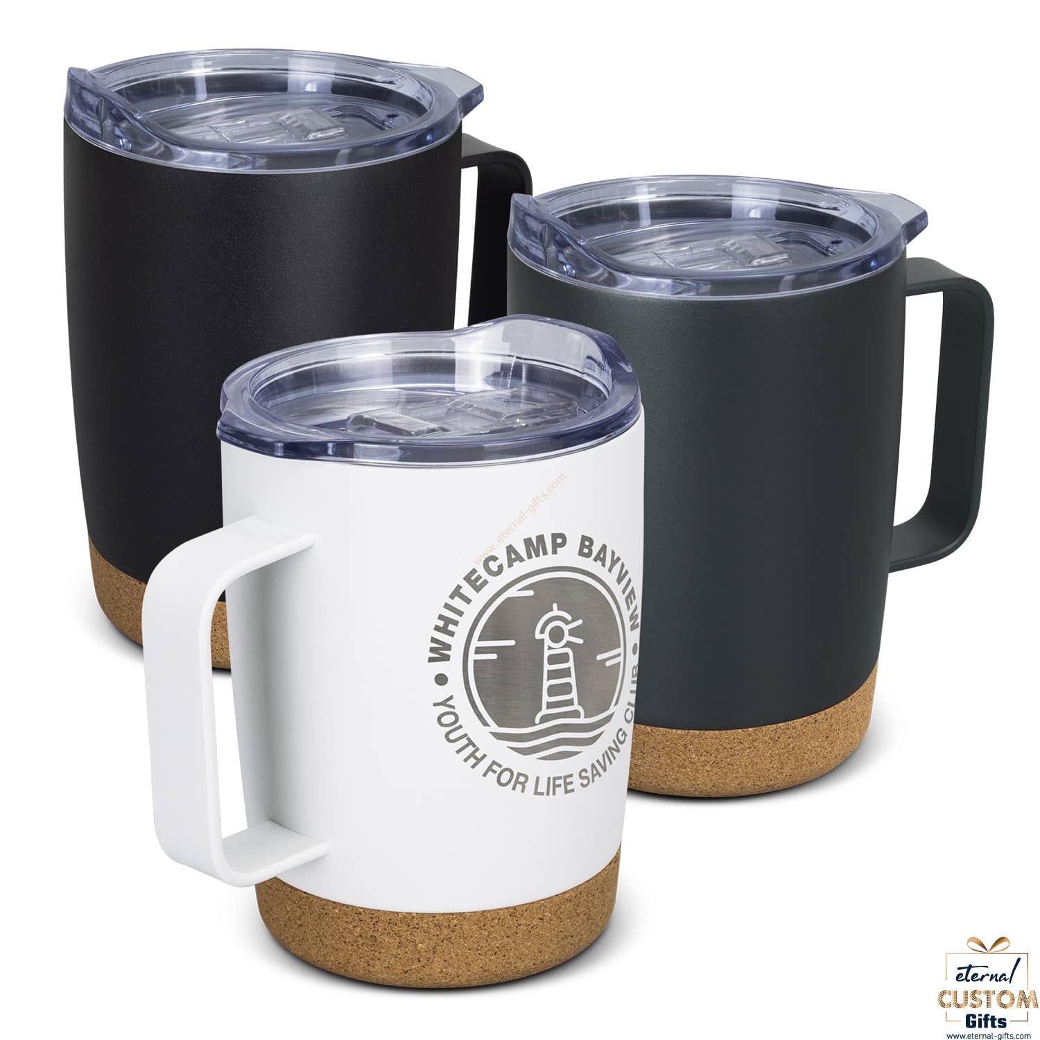 Stylish 350ml stainless steel vacuum insulated mug with a cork base and a tough powder coated finish. It has a transparent push on lid with a sliding closure and is presented in a natural gift box.