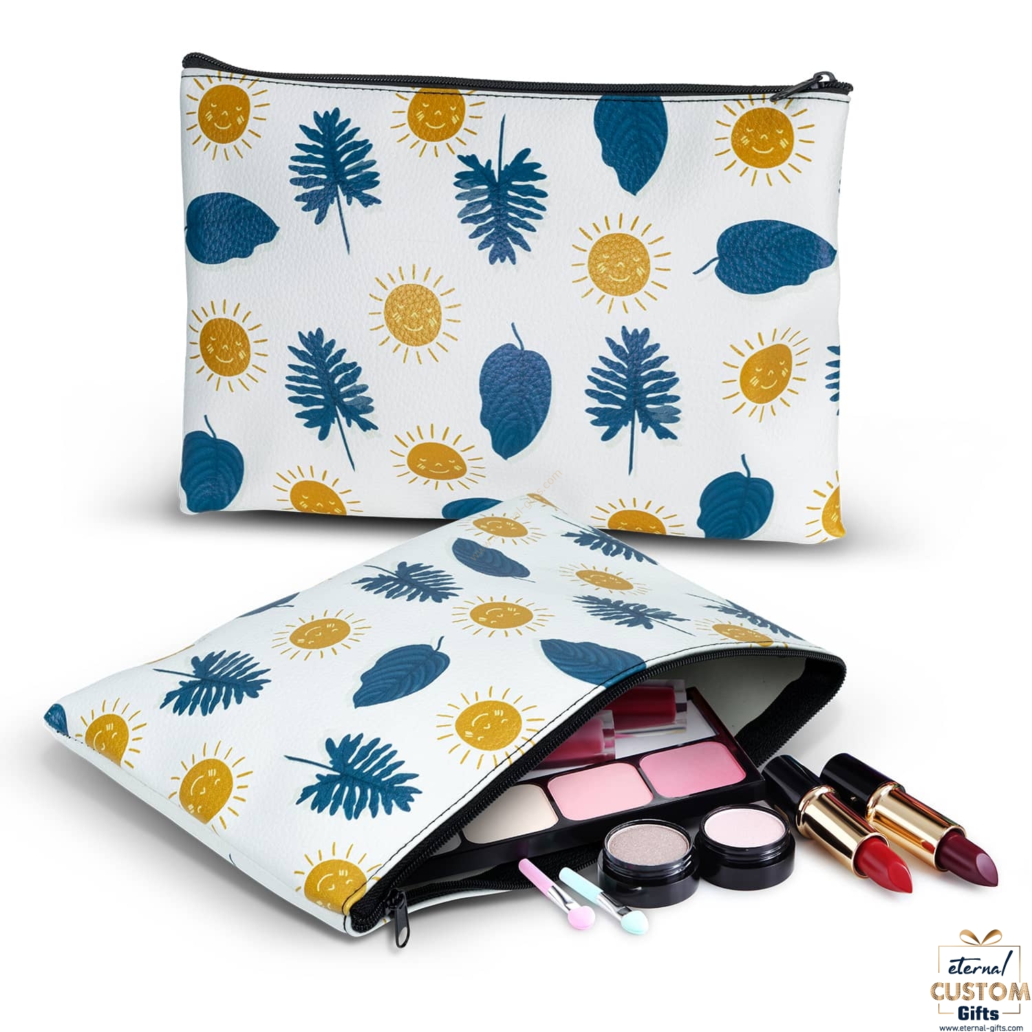 Medium cosmetic bag manufactured from leather look PU and is branded in full colour on both sides with no extra cost. Flora has a black zipper and the stitching matches the zip colour. A production lead time of 25 working days applies to this product.