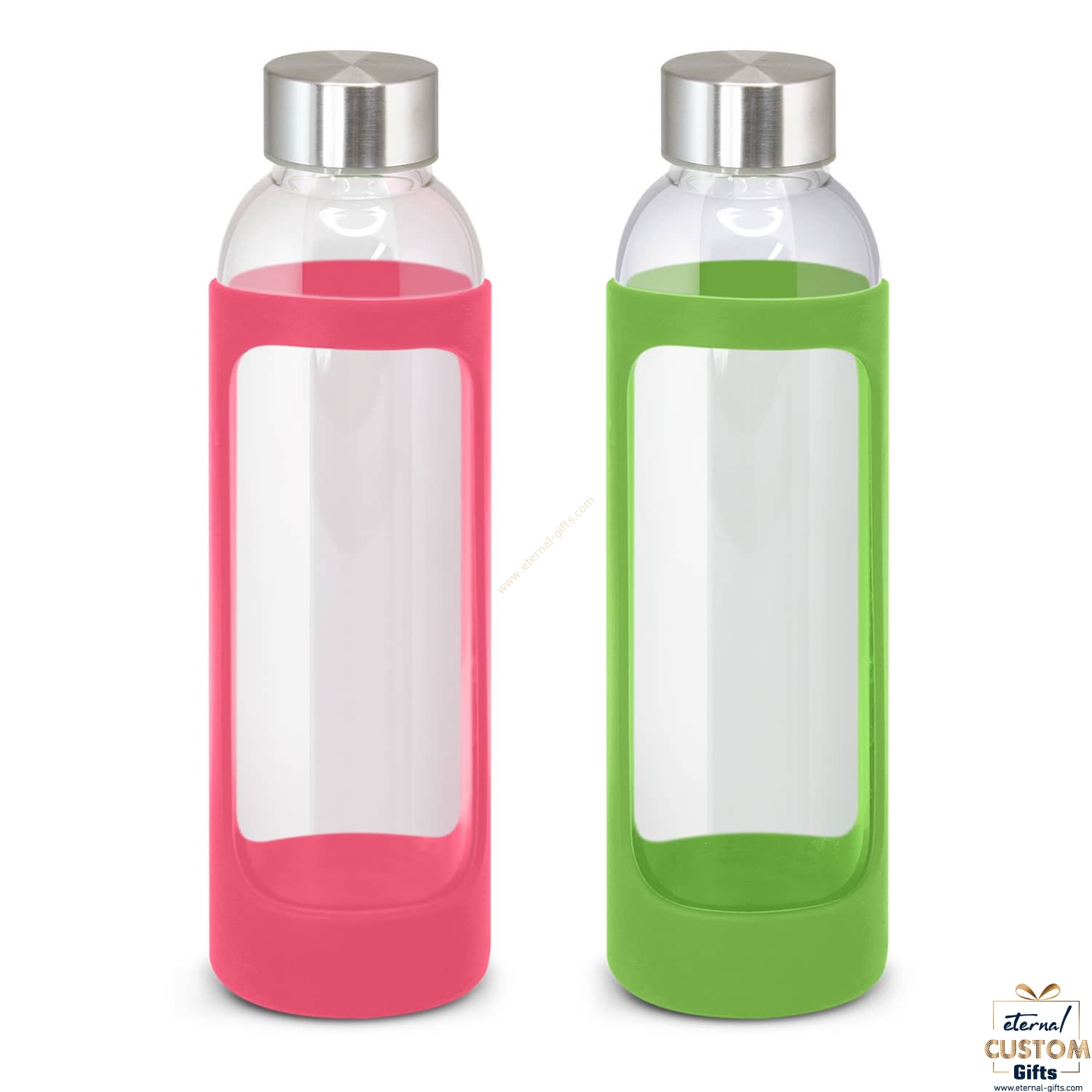 Deluxe 600ml borosilicate glass drink bottle which features a protective soft touch silicone sleeve and a secure screw on stainless steel lid that can be laser engraved with a logo. Borosilicate is a lightweight glass that is exceptionally strong and shatter resistant. Glass is a natural choice for a clean, pure taste and is a safe and reusable plastic alternative. This product is not intended to be used with carbonated or hot liquids and handwashing is recommended.