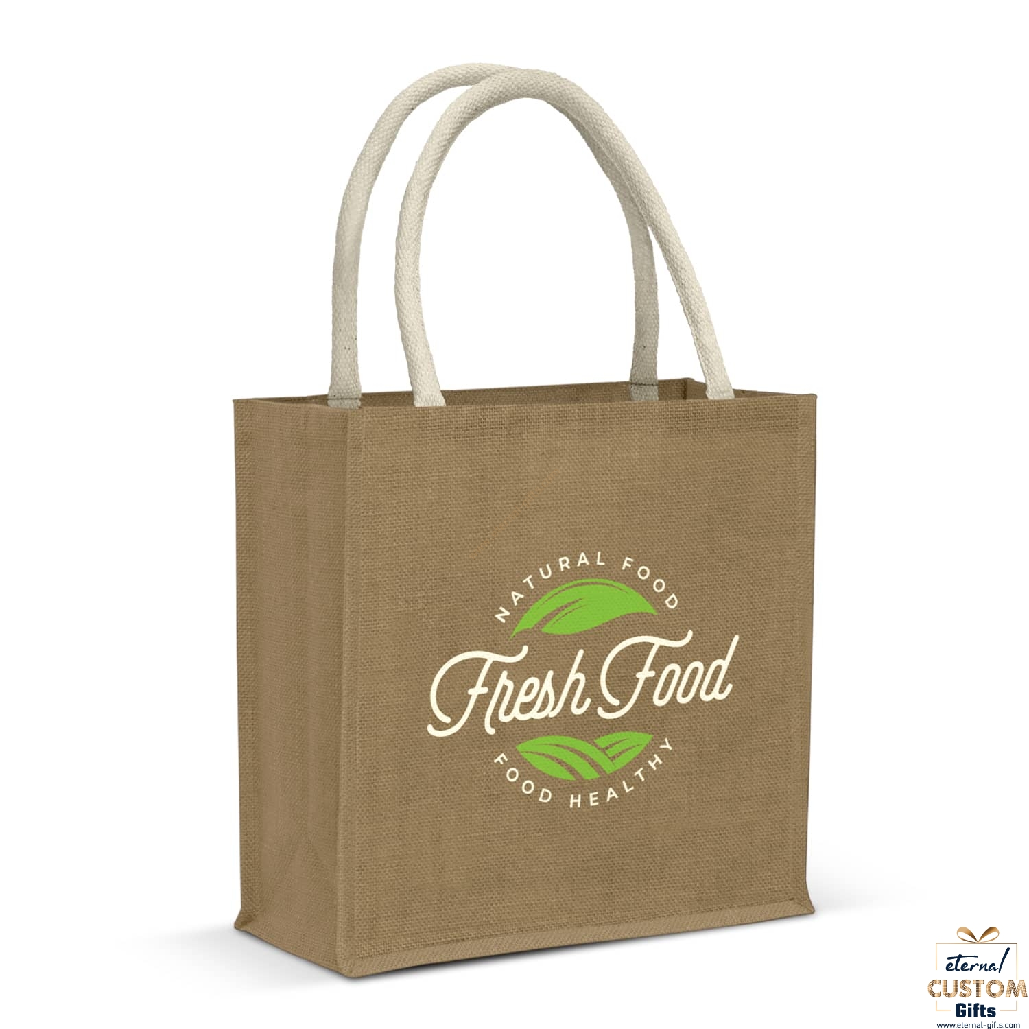 Durable reinforced 17L jute tote bag. The tote bag is reinforced with 290GSM corn starch jute with natural cotton handles.