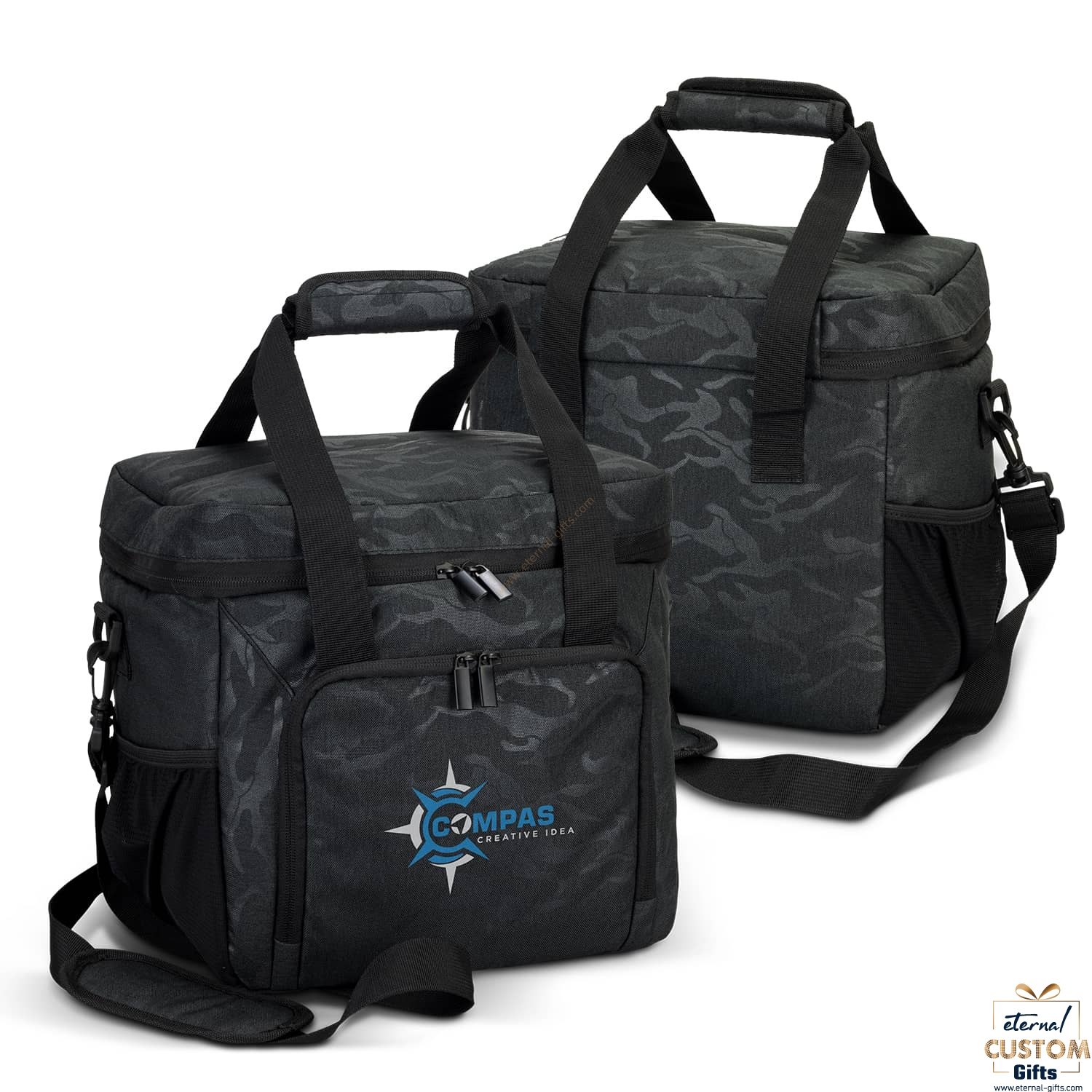 Practical 17L cooler bag manufactured from 300D polyester with a stylised camouflage pattern. The bag has thick PE foam insulation encased in a water-resistant PEVA inner liner. It features an adjustable shoulder strap, a zippered front pocket, two mesh side pockets, and carry handles with a Velcro cuff.