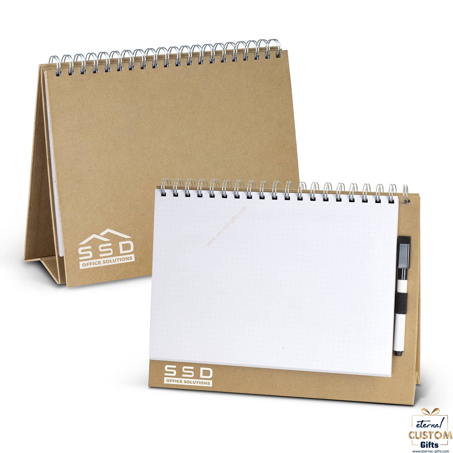 Unique and versatile hard cover wiro-bound notebook with eight leaves (16 pages) of dotted whiteboard card. The kraft cardboard cover doubles as a desk stand, transforming the notebook into a desktop planner. An elastic pen loop holds a whiteboard pen with an eraser built into the lid.