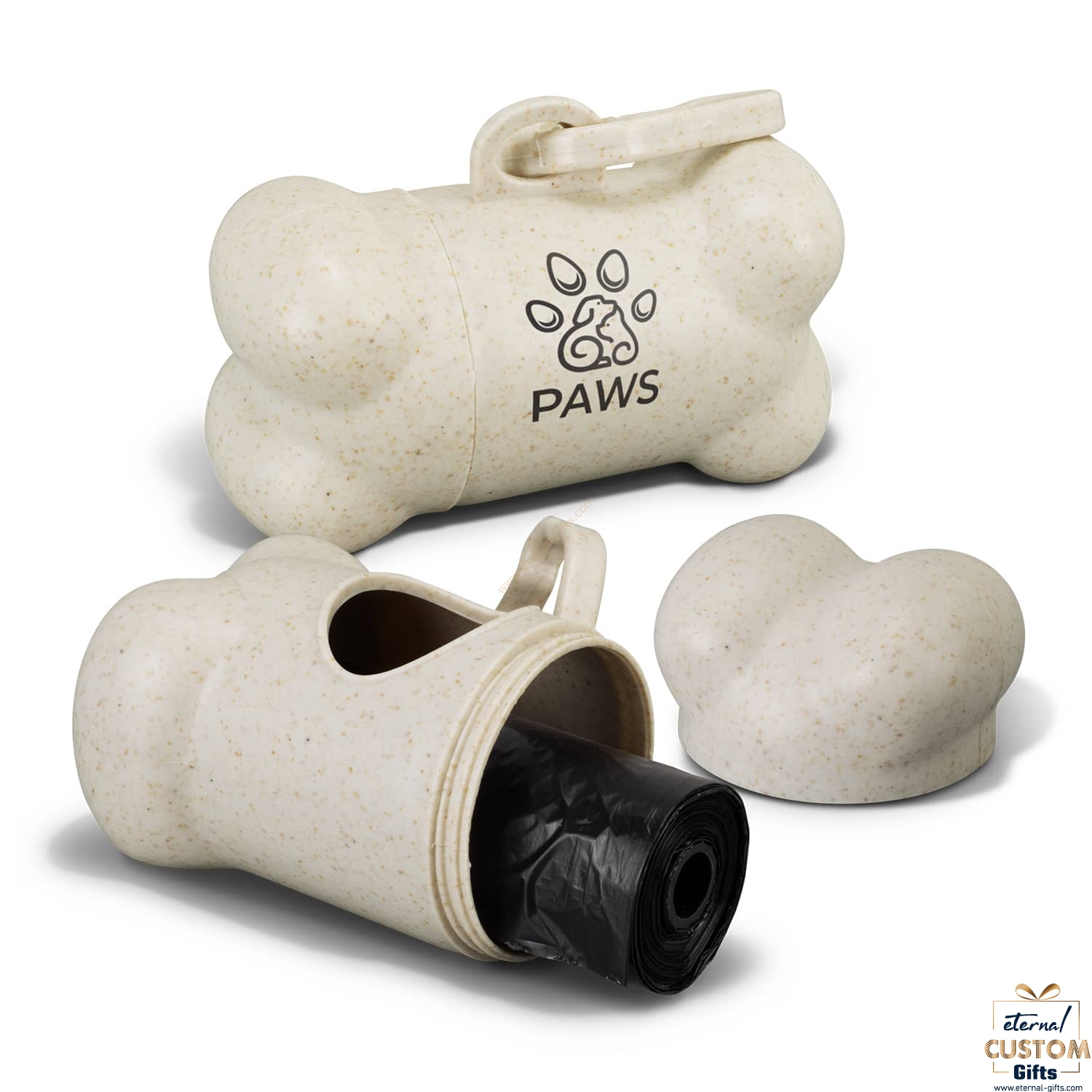 Handy pet waste bag dispenser made from a blend of wheat straw fibre and polypropylene with a useful clip for attaching to bags, collars and leads. The dispenser features a screw on lid and includes 15 waste bags made from polyethylene.