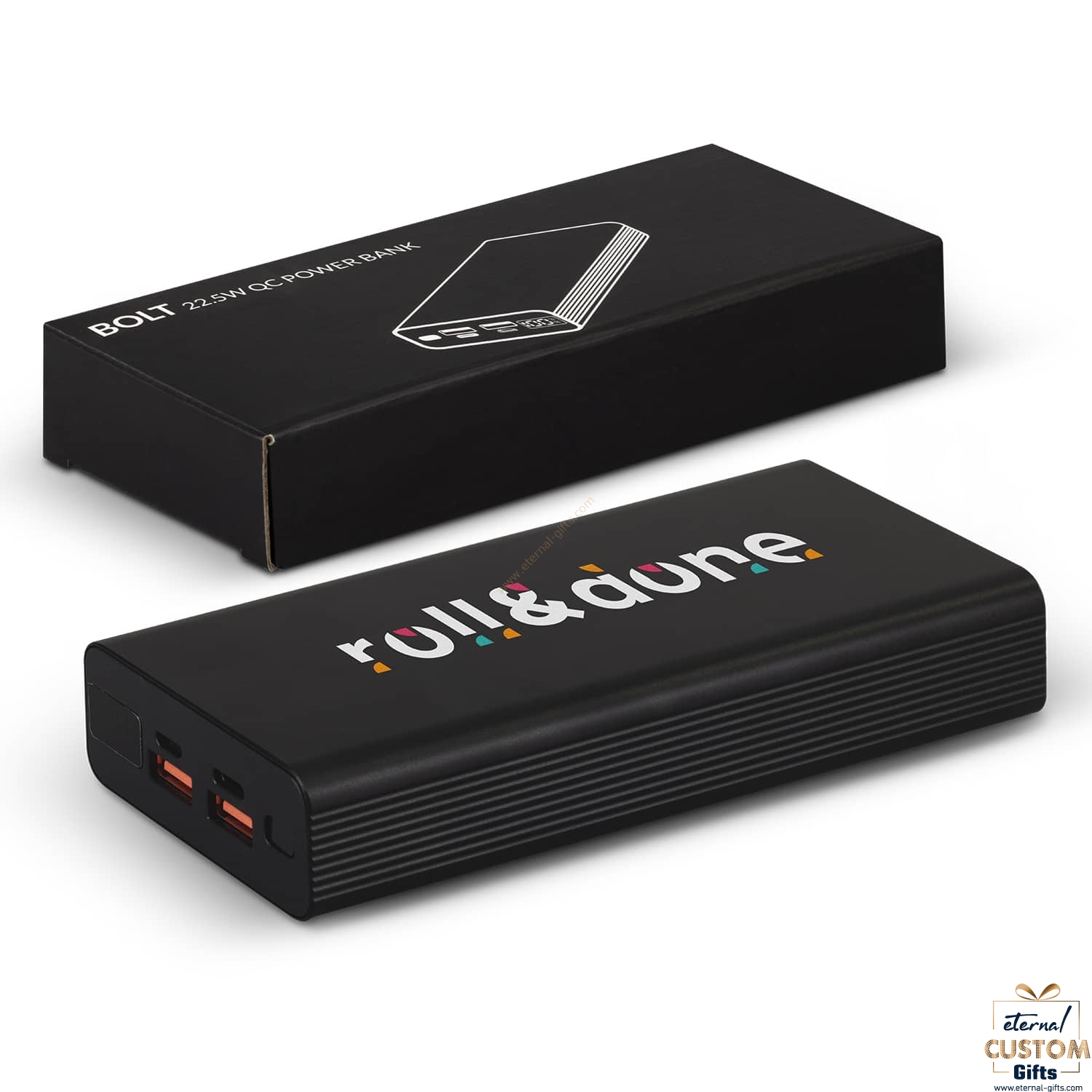 High performance 20,000mAh power bank that delivers up to 22.5W QC and 18W PD quick charge capability. Bolt is capable of charging up to three devices simultaneously and features a digital power gauge to show the power percentage remaining. The power bank has Micro-B and Type-C inputs with a Type-C and two USB-A outputs. This impressive power bank is presented in a printed black gift box. An optional EVA carry case and a triple connector cable are available on request.