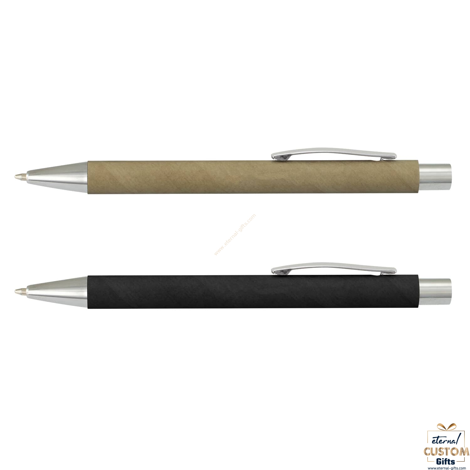 Retractable ballpoint pen with a kraft paper barrel and shiny chrome trim. It has a black large volume refill with 1200 metres of German manufactured Dokumental ink and it can be presented in an optional pen sleeve.