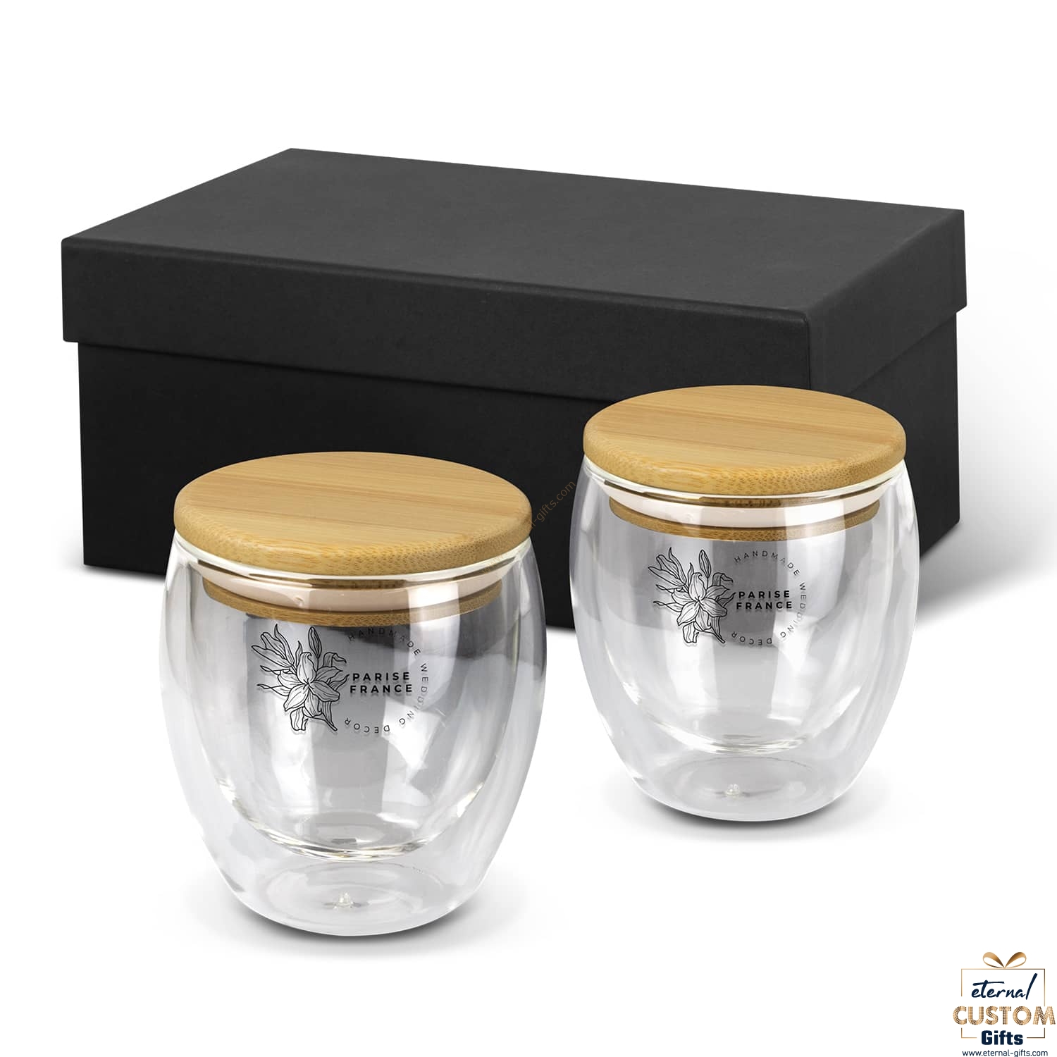 Stunning set of two 250ml Azzurra Glass Cups. These premium cups are made from double wall, shatter-resistant borosilicate glass and feature a natural bamboo lid with a silicone seal. The cups are presented in a premium black gift box and are an elegant gifting solution.