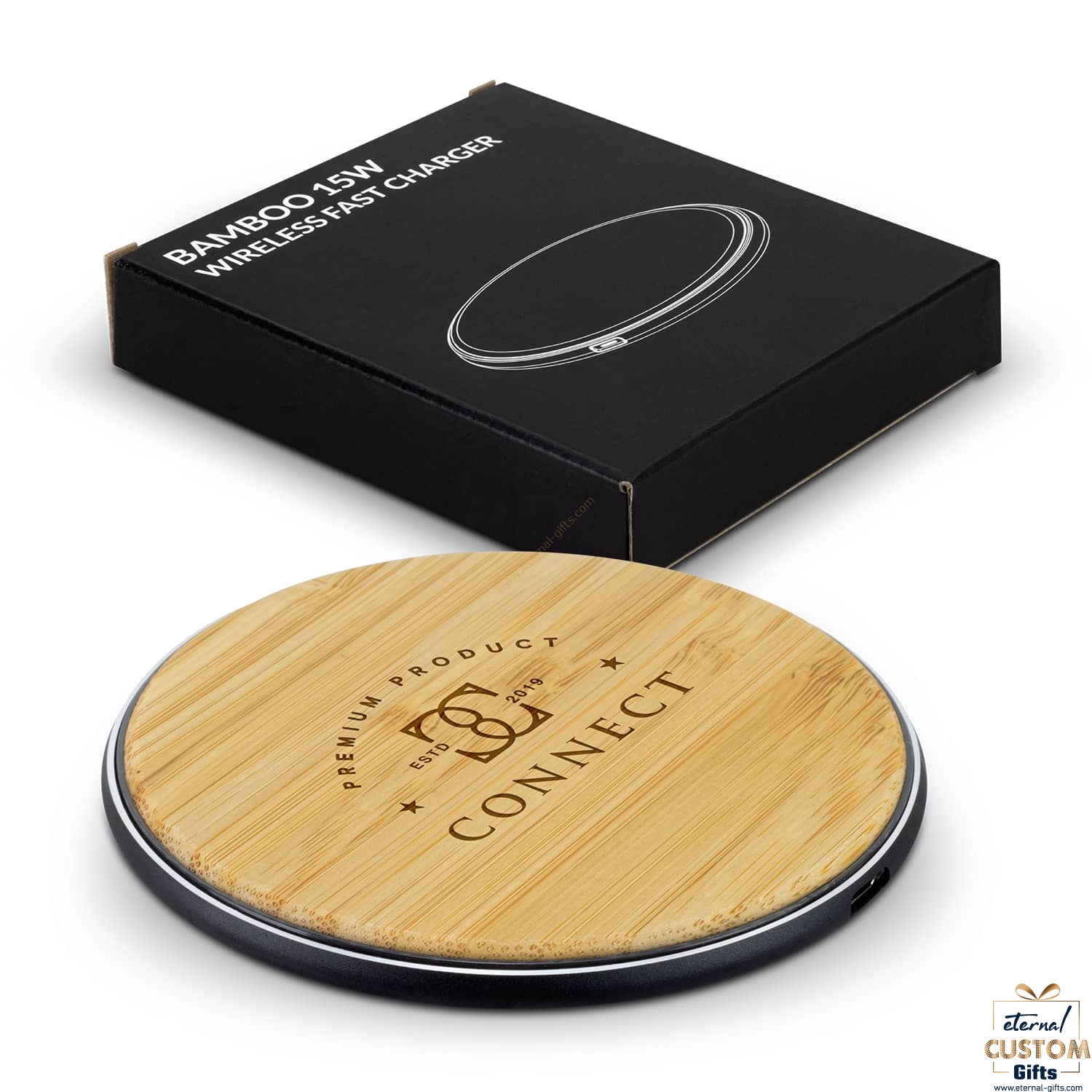 Handy 15W wireless charger with fast charging capability. The charger features a natural bamboo charging pad and an aluminium base. An outer ring illuminates to indicate charging status. For convenient wireless charging, simply plug it into any USB port or mains adapter and place a compatible device on the bamboo charging pad. The charger will work with most modern devices and is presented in a printed black gift box with instructions.
