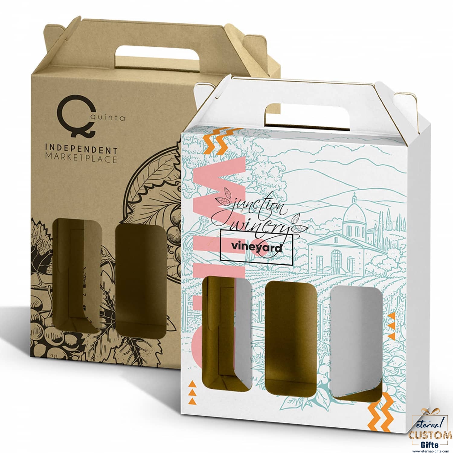 Professional custom wine presentation box made from durable 1.5mm e-flute corrugated cardboard with display windows. This box holds three standard wine bottles, perfect for gifting and building strong brand recognition. Featuring a convenient carry handle, the box’s exterior can be customised with CMYK digital print. It is supplied flat-packed for easy postage and storage, and its self-locking design ensures hassle-free assembly. The assembled internal dimensions are 262mm x 88mm x 335mm (LxWxH).