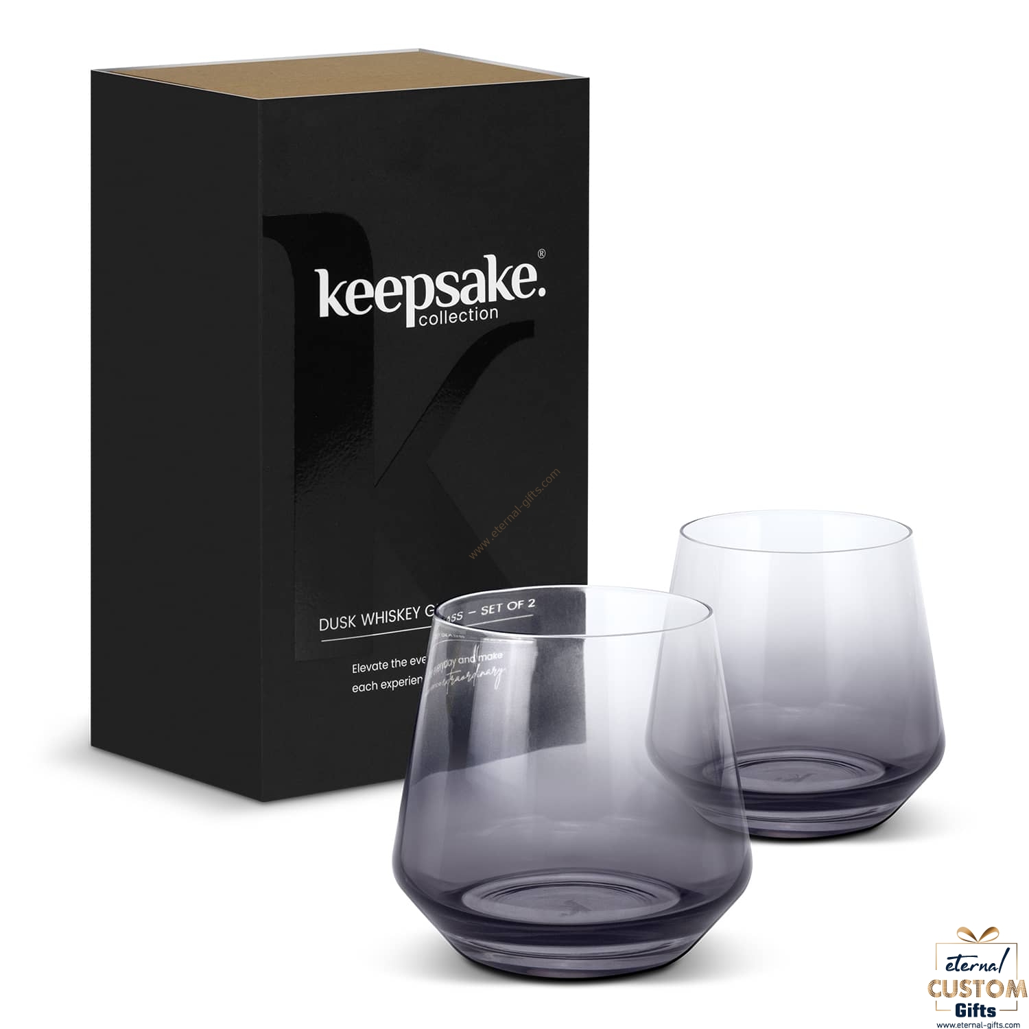 Elegant set of two 400ml whiskey glasses featuring a subtle ombre tint, a design element that adds a unique flair to this sophisticated gifting solution. The Dusk set is beautifully presented in a natural gift box with a Keepsake branded sleeve.