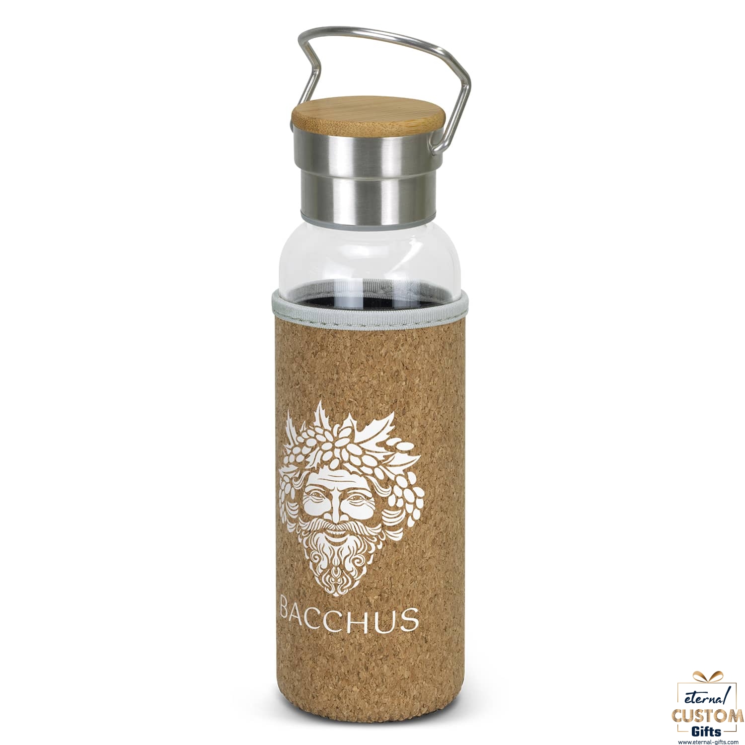 Classic 600ml borosilicate glass drink bottle with an insulative neoprene sleeve featuring a natural cork outer. Borosilicate is lightweight, exceptionally strong and is shatter-resistant. The bottle features a secure screw on lid with a convenient carry handle and a natural bamboo panel. An optional gift tube is available for presentation.