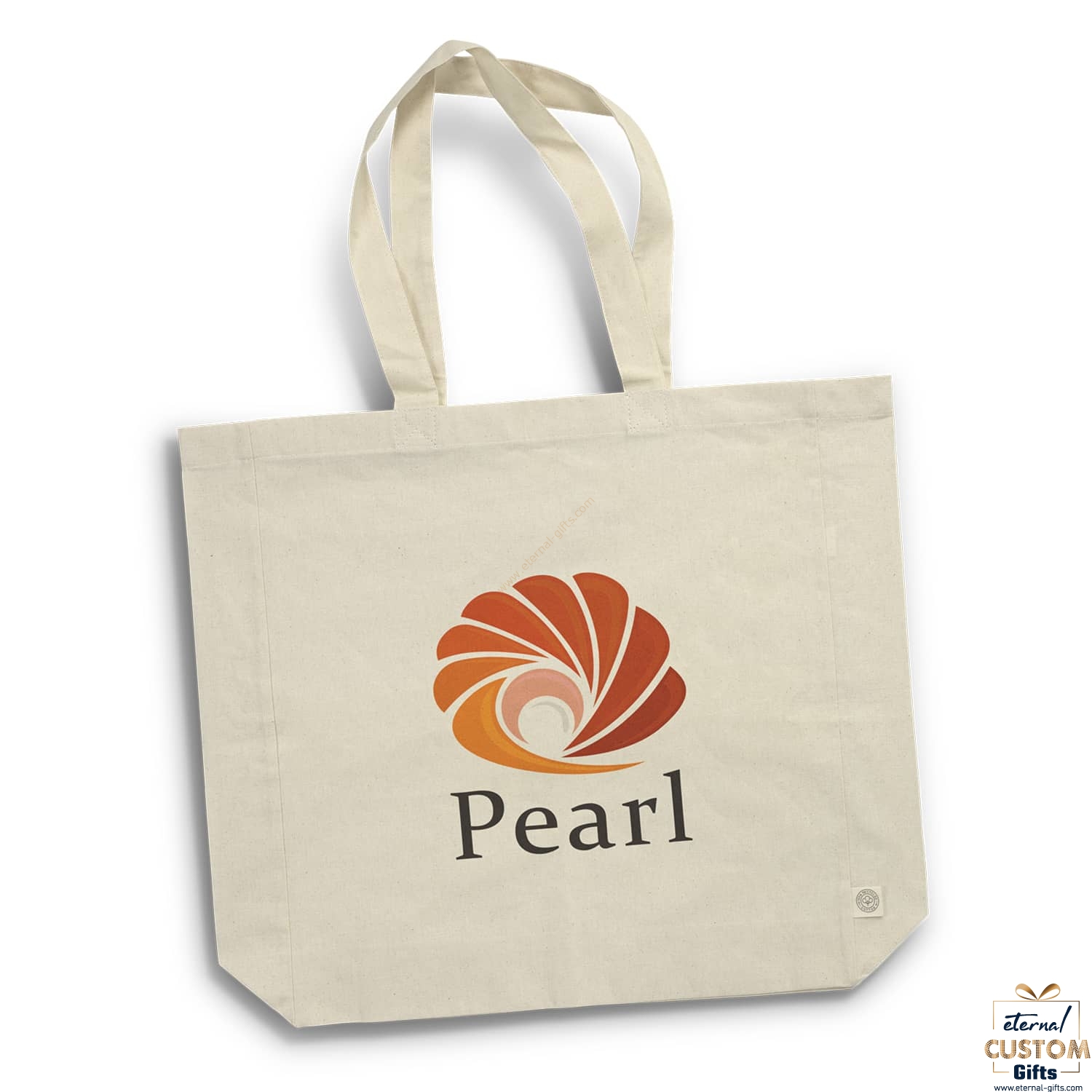 This stylish and environmentally conscious 13L tote bag is made from 100% recycled, unbleached natural cotton. It features a base gusset for extra capacity and long handles for easy shoulder carrying.