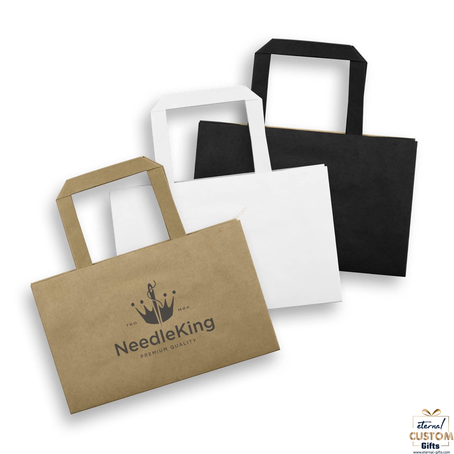 Small carry bag made from 180gsm paper with a reinforced base and square-folded 100gsm paper handles. This bag is landscape orientated with handles and gusset along the longer edges.