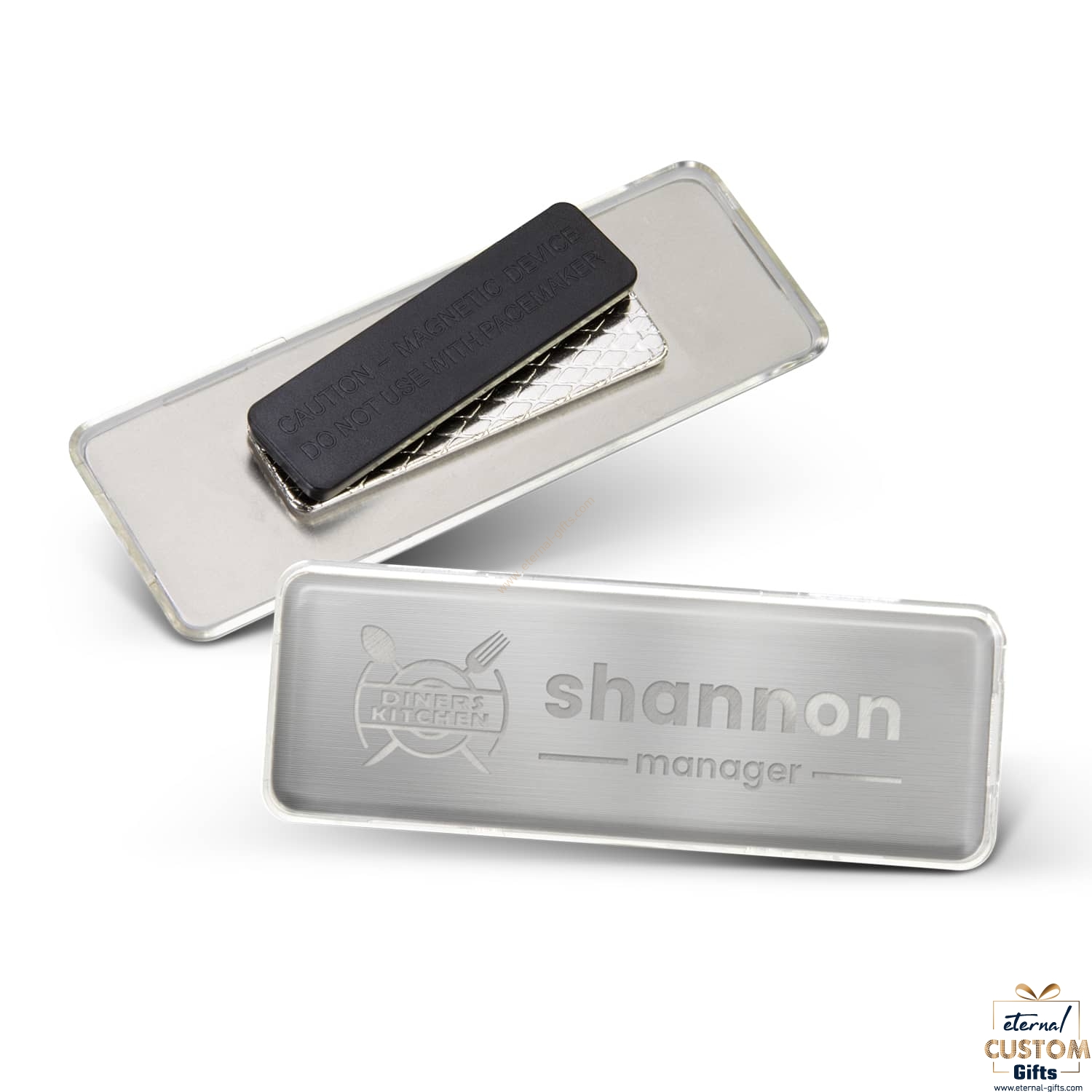 • Rectangular metal name badge with magnetic backing