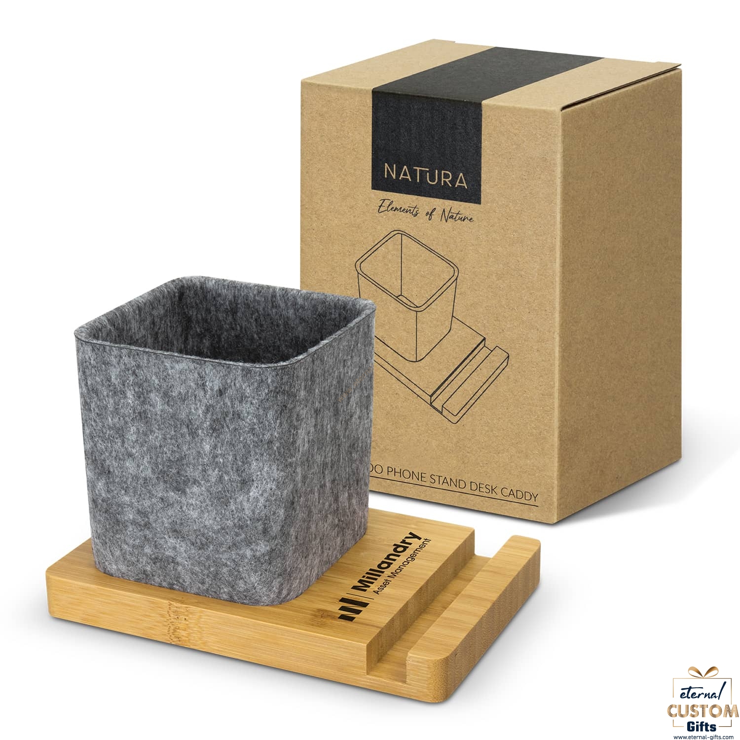 - Caddy is made from GRS certified recycled felt and rests on a bamboo base