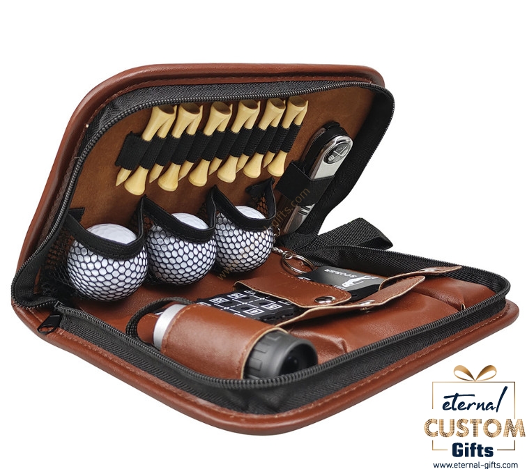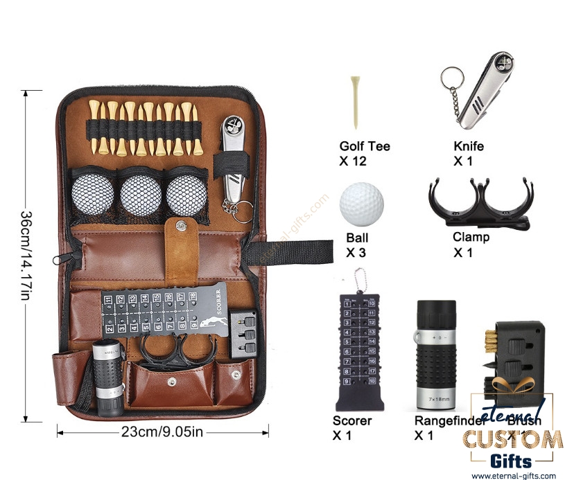 Description Custom make Golf Accessories gift Set with Hi-End Case, Golf Balls, Rangefinder, Golf Tees, Brush, Multifunctional Divot Knife, Scorer, Golf Ball Clamp 2/size:25*18*5cm