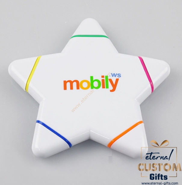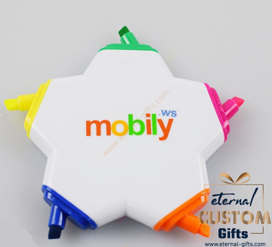 Description Customized five-pointed star fluorescent highlighter pen, 5 colors, student marker pen.Material: ABS & PP caps Price includes logo printing full colors 1 side