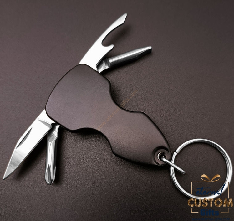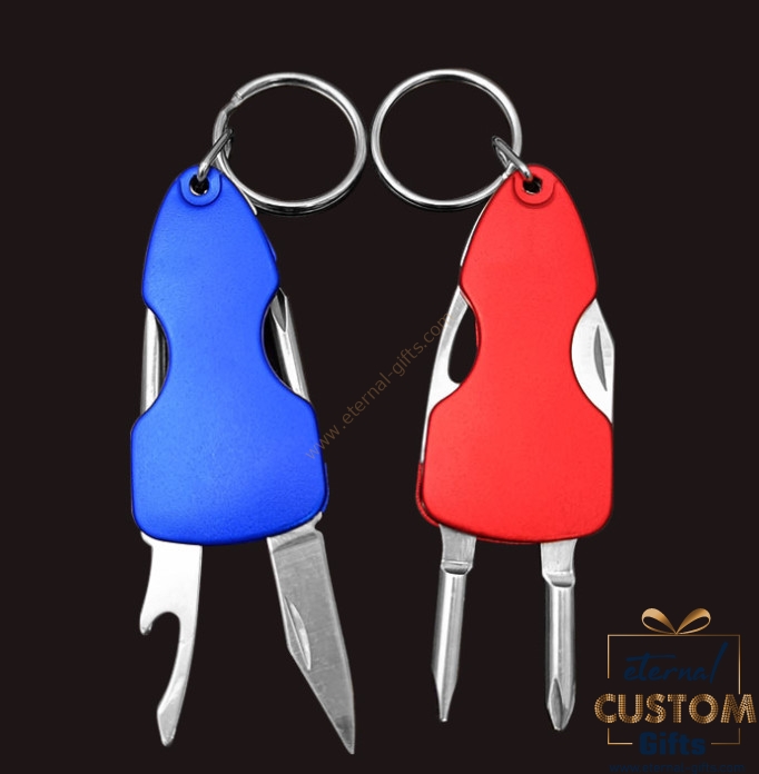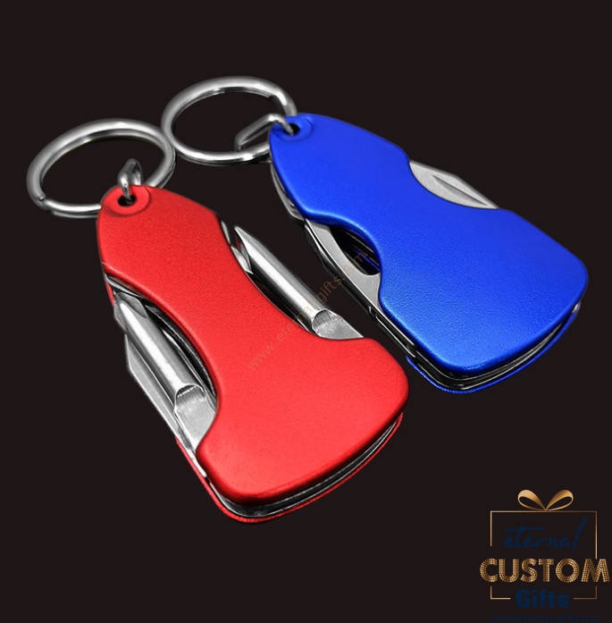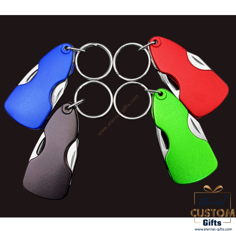 Multi function 6 tools kit, includes knife, slotted screwdriver, Phillips screwdriver, awl, bottle opener, and key ring. Metal construction, solid aluminum outer case with plenty of room for your logo or message. Pocket sized for easy carrying and use. Ideal for key holder, key tag, key chain, key ring, outdoor, hunting, safety program, emergency, travel, camping, and self promos.