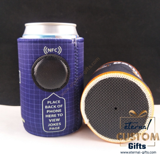 Description #Custom Quality NFC Stubby Coolers Material Neoprene Size: Dia 6.5 x H11cm, other size can be custom, contact with us for template Features # 5-6 mm thickness # Top & bottom overlocking # with base # Full color printing # With NFC tag