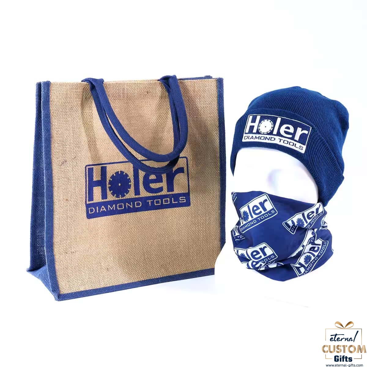 one stop custom promo jute bags,beanies and bandanna gifts set